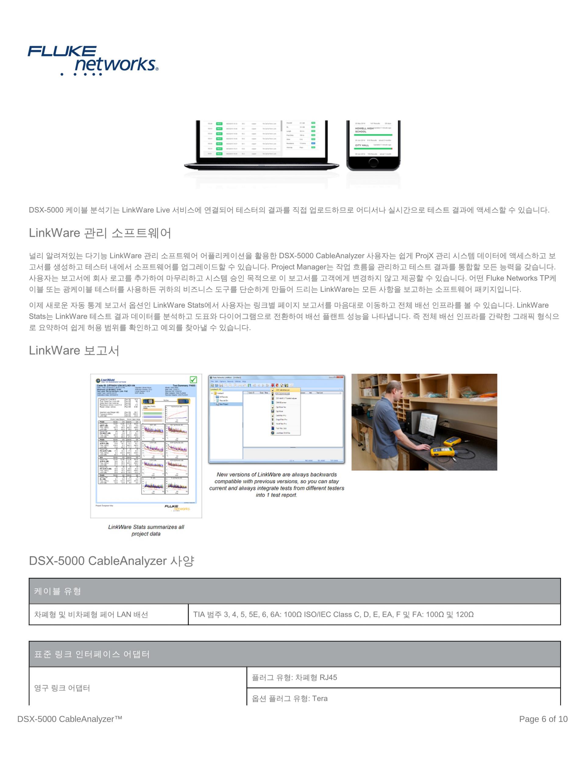 DSX CableAnalyzer 시리즈 사용자는 널리 알려진 다기능 LinkWare PC 관리 소프트웨어 애플리케이션을 활용하여 쉽게 ProjX 관리 시스템 데이터에 액세스하고, 보고서를 생성하고, 테스터 내에서 소프트웨어를 업그레이드할 수 있습니다. Project Manager는 작업 흐름을 관리하고 테스트 결과를 통합할 모든 능력을 갖습니다. 사용자는 보고서에 회사 로고를 추가하여 마무리하고 시스템 승인 목적으로 이 보고서를 고객에게 변경하지 않고 제공할 수 있습니다. Fluke Networks의 어떠한 구리선 또는 광케이블 테스터를 사용하든 작업 도구를 간단하게 만들어 주는 LinkWare PC는 모든 사항을 보고하는 소프트웨어 패키지입니다.
