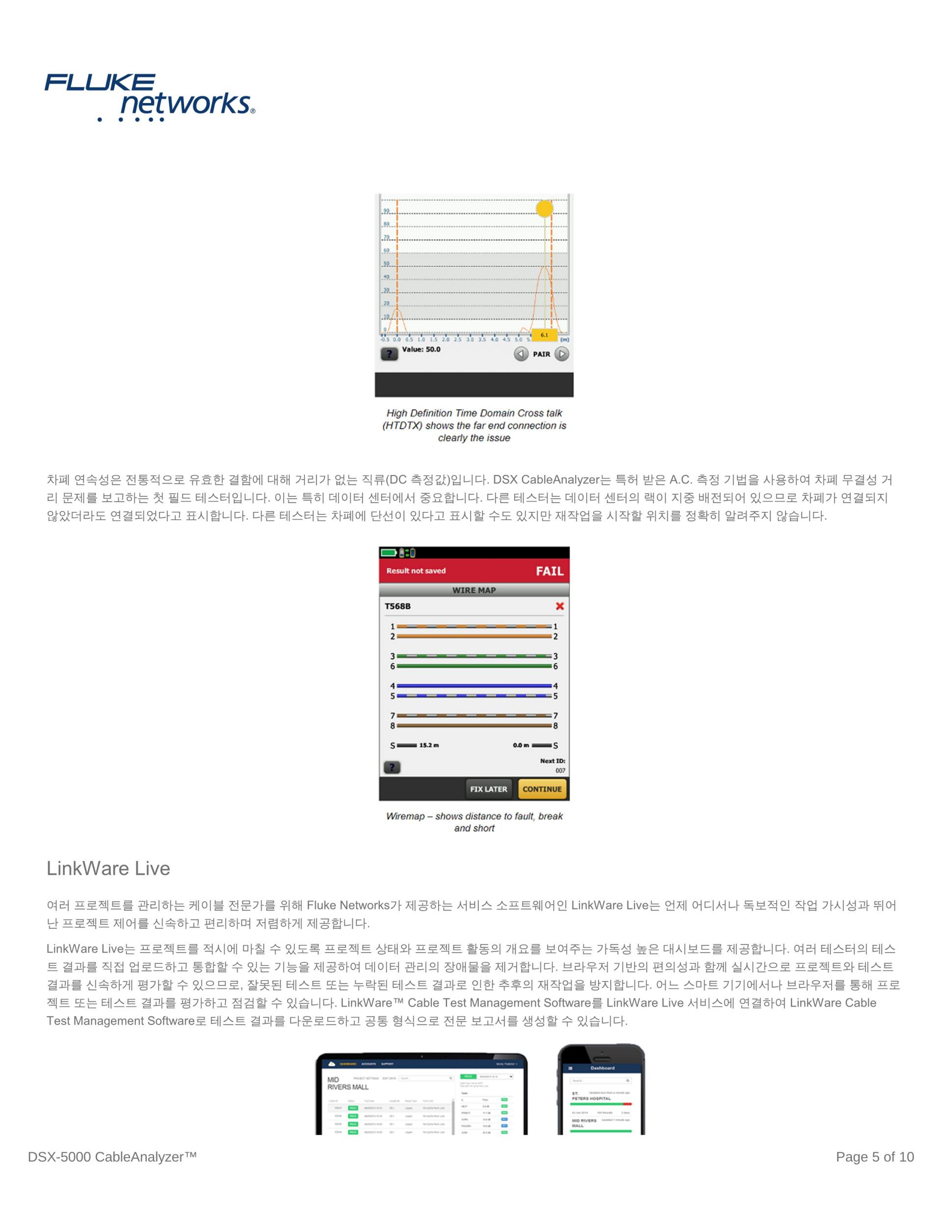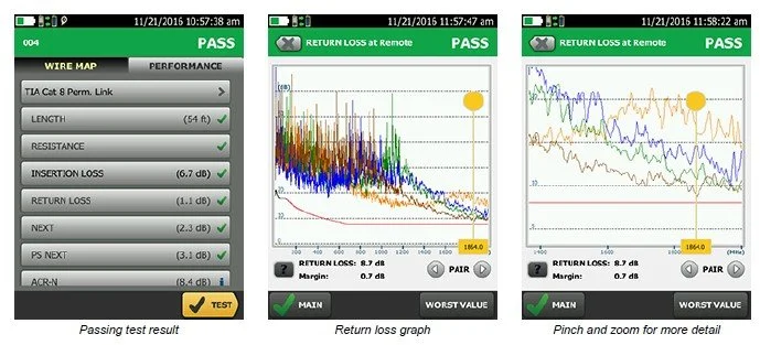 전용 진단 제품인 DSX는 버튼 하나로 테스트를 실행하고 모든 정보를 저장하여 배선 결함 수정에 필요한 시간을 단축시킵니다. 그래픽 결과 화면을 통해 케이블의 특정 링크에서 크로스톡, 반사 손실 또는 차폐 결함이 발생하는 정확한 장소를 볼 수 있습니다. 이전 테스터는 최대 250MHz까지만 진단 정확도의 주파수 제한이 있었으나 DSX CableAnalyzer 시리즈는 이러한 제한이 없습니다. 이러한 일반적인 보기를 통해 초보 기술자와 전문가가 똑같이 쉽게 해석하고 불합격된 결과를 분리하여 빠르게 조치하며 테스트 결과는 원격으로 분석하기 위해 저장합니다.