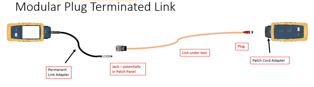 DSX CableAnalyzer™는 한쪽에 패치 코드 어댑터를, 그리고 반대쪽 끝에 영구 링크를 사용함으로써 MPTL을 인증할 수 있습니다(아래 이미지 참조).