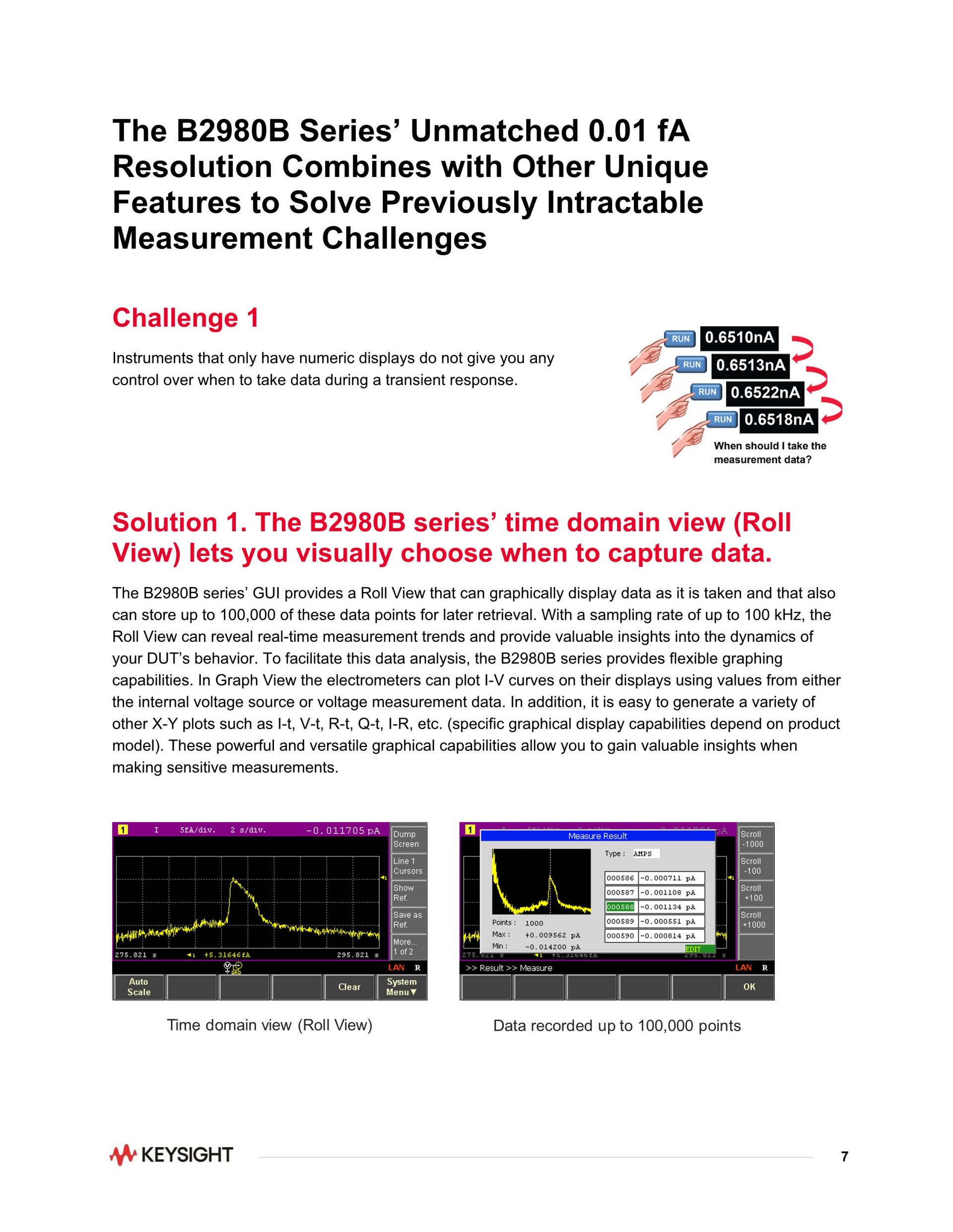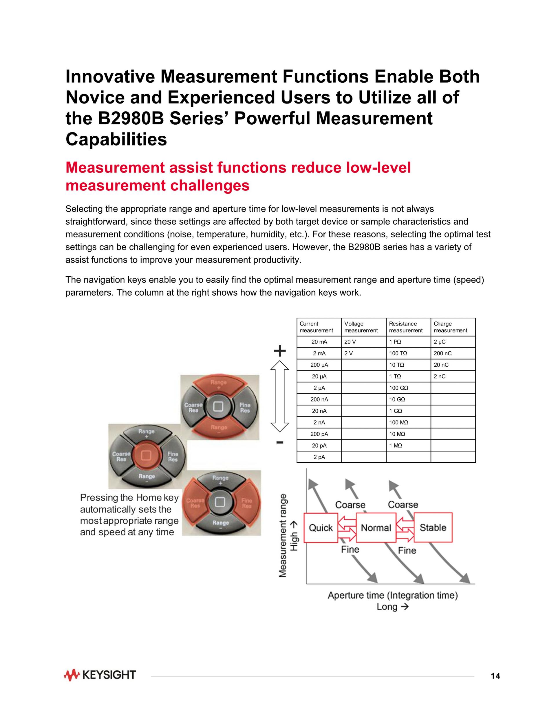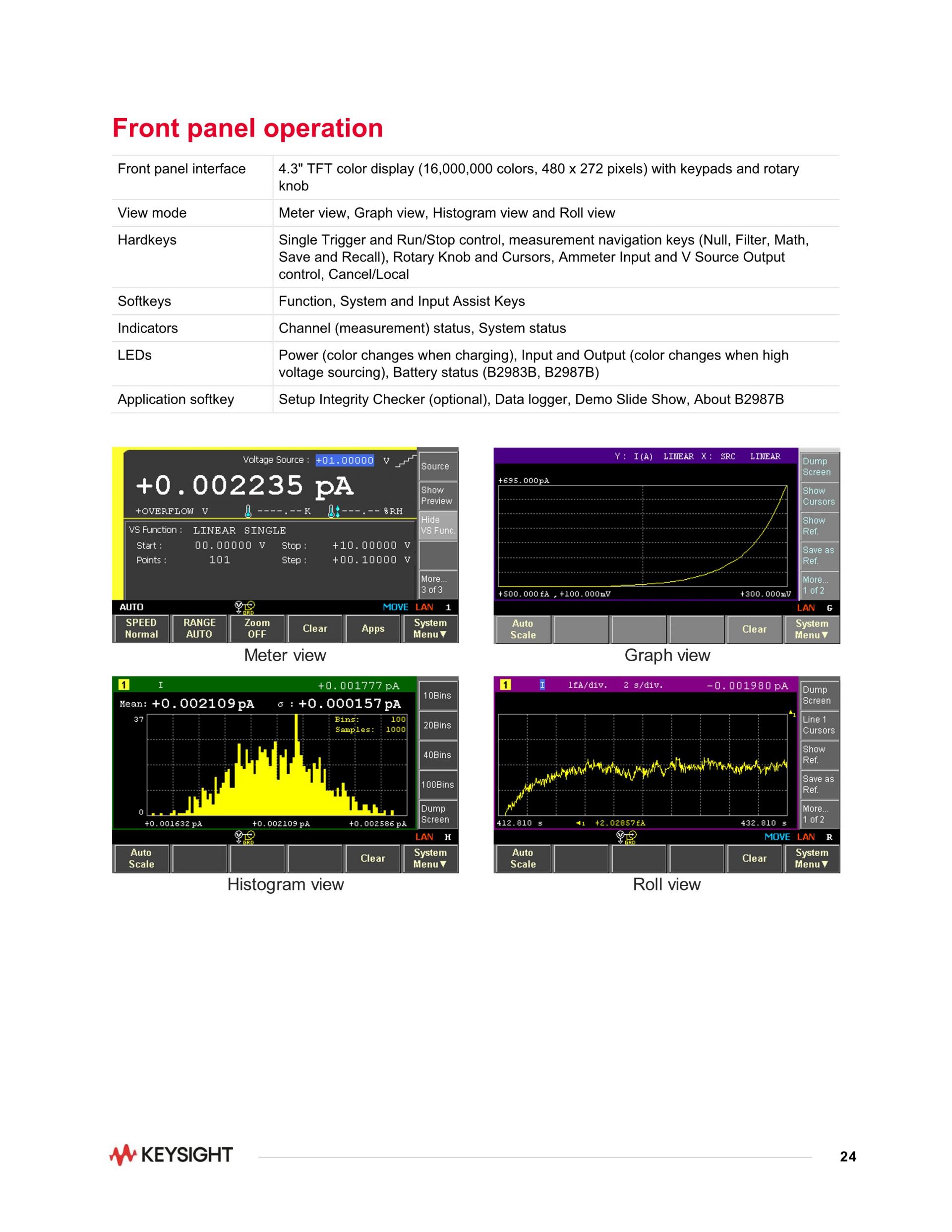 B2985B 전위계/고저항 미터는 0.01fA(0.01 x 10-15A) 분해능과 최대 10PΩ(10 x 1015Ω)에 달하는 큰 저항으로 소전류를 정확하게 확실히 측정할 수 있는 세계 유일의 그래픽 전위계입니다. 4.3” 컬러 LCD와 그래픽 사용자 인터페이스를 지원하는 이 전류계는 수치 정보 외에 트렌드 차트와 히스토그램 데이터도 제공합니다. 이러한 전면판 기능을 통해 PC 없이도 트랜션트 동작을 캡처하고 빠르게 통계 분석을 수행할 수 있습니다. 셋업 무결성 검사 소프트웨어 옵션을 이용하면 여러 케이블과 픽스처 도구의 노이즈 레벨을 비교할 수 있어 외부 노이즈 소스를 격리하는 데 도움이 됩니다.