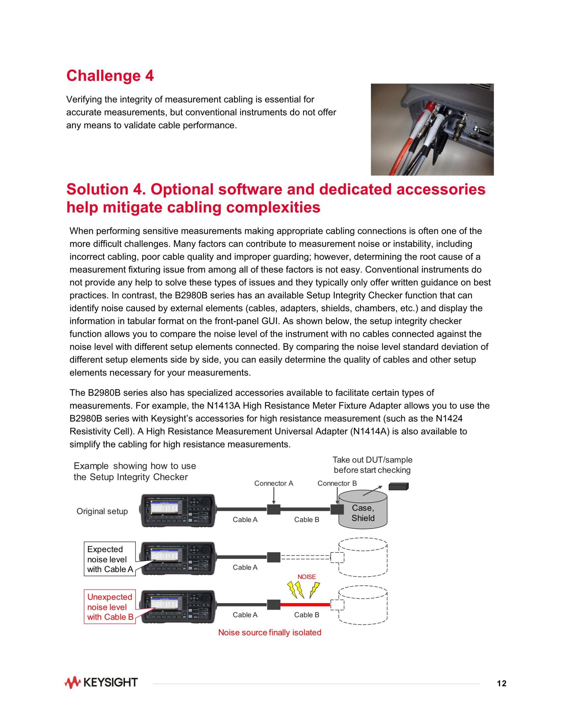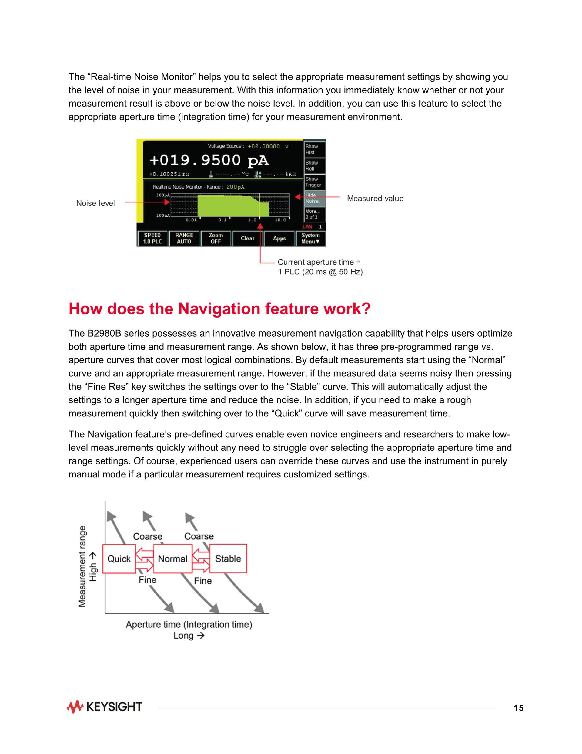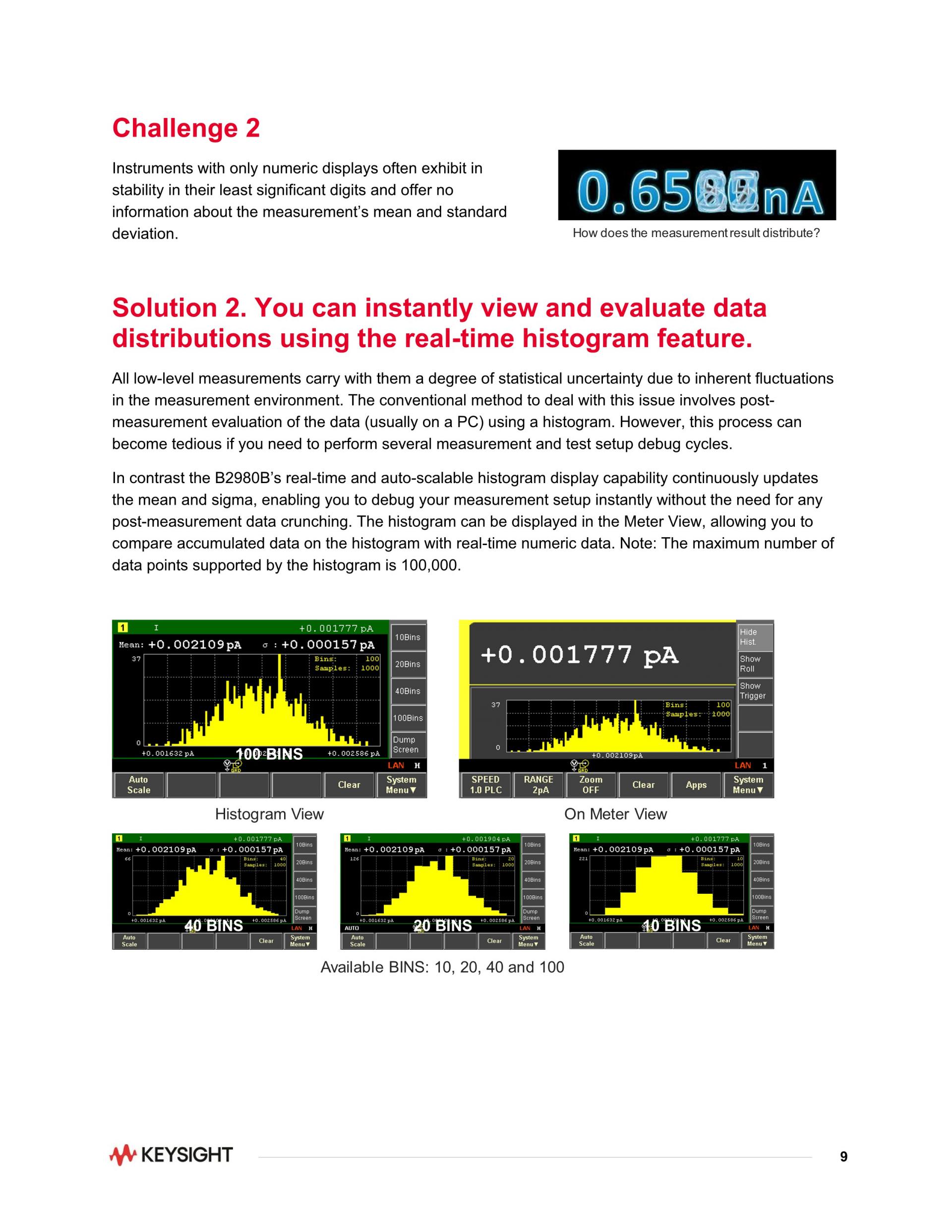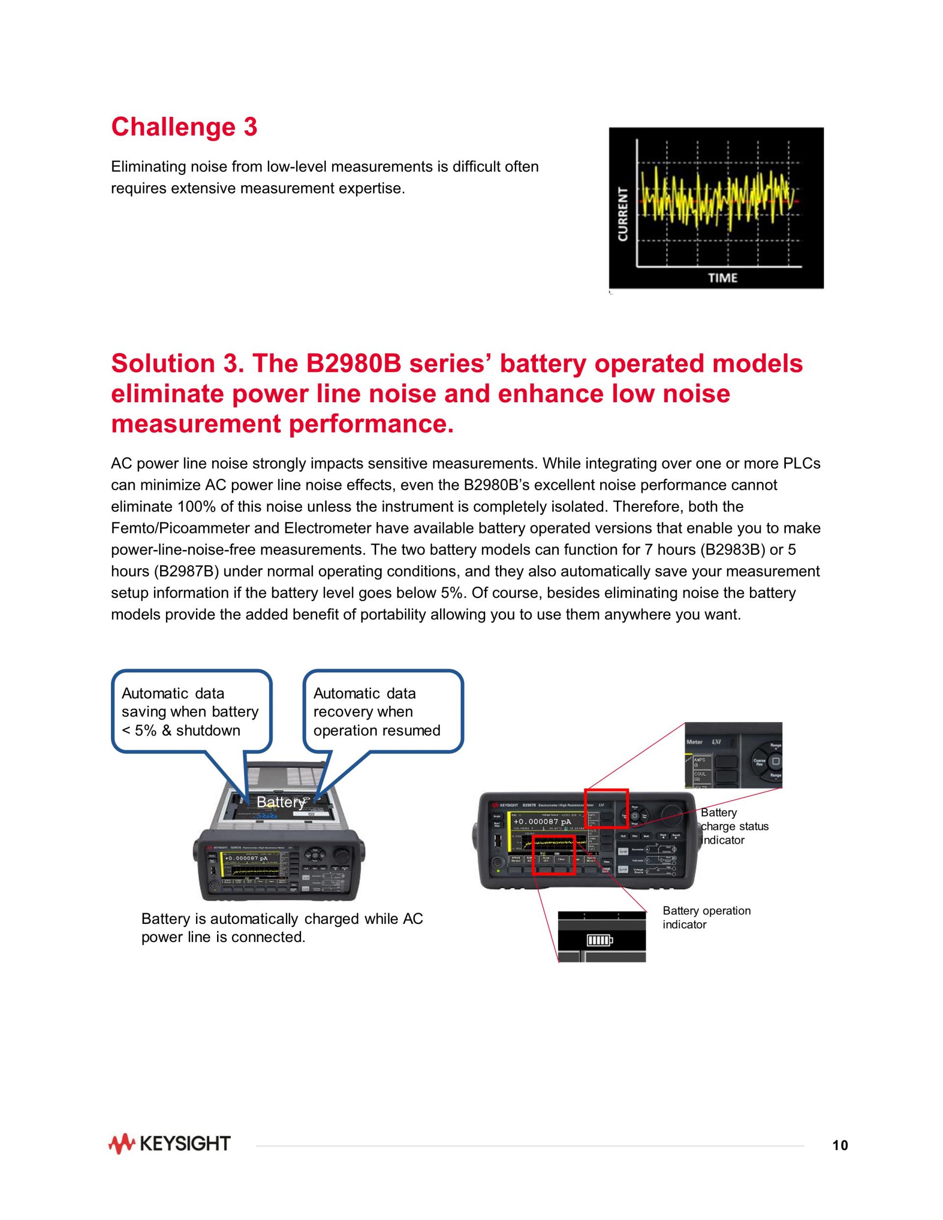 B2985B 전위계/고저항 미터는 0.01fA(0.01 x 10-15A) 분해능과 최대 10PΩ(10 x 1015Ω)에 달하는 큰 저항으로 소전류를 정확하게 확실히 측정할 수 있는 세계 유일의 그래픽 전위계입니다. 4.3” 컬러 LCD와 그래픽 사용자 인터페이스를 지원하는 이 전류계는 수치 정보 외에 트렌드 차트와 히스토그램 데이터도 제공합니다. 이러한 전면판 기능을 통해 PC 없이도 트랜션트 동작을 캡처하고 빠르게 통계 분석을 수행할 수 있습니다. 셋업 무결성 검사 소프트웨어 옵션을 이용하면 여러 케이블과 픽스처 도구의 노이즈 레벨을 비교할 수 있어 외부 노이즈 소스를 격리하는 데 도움이 됩니다.