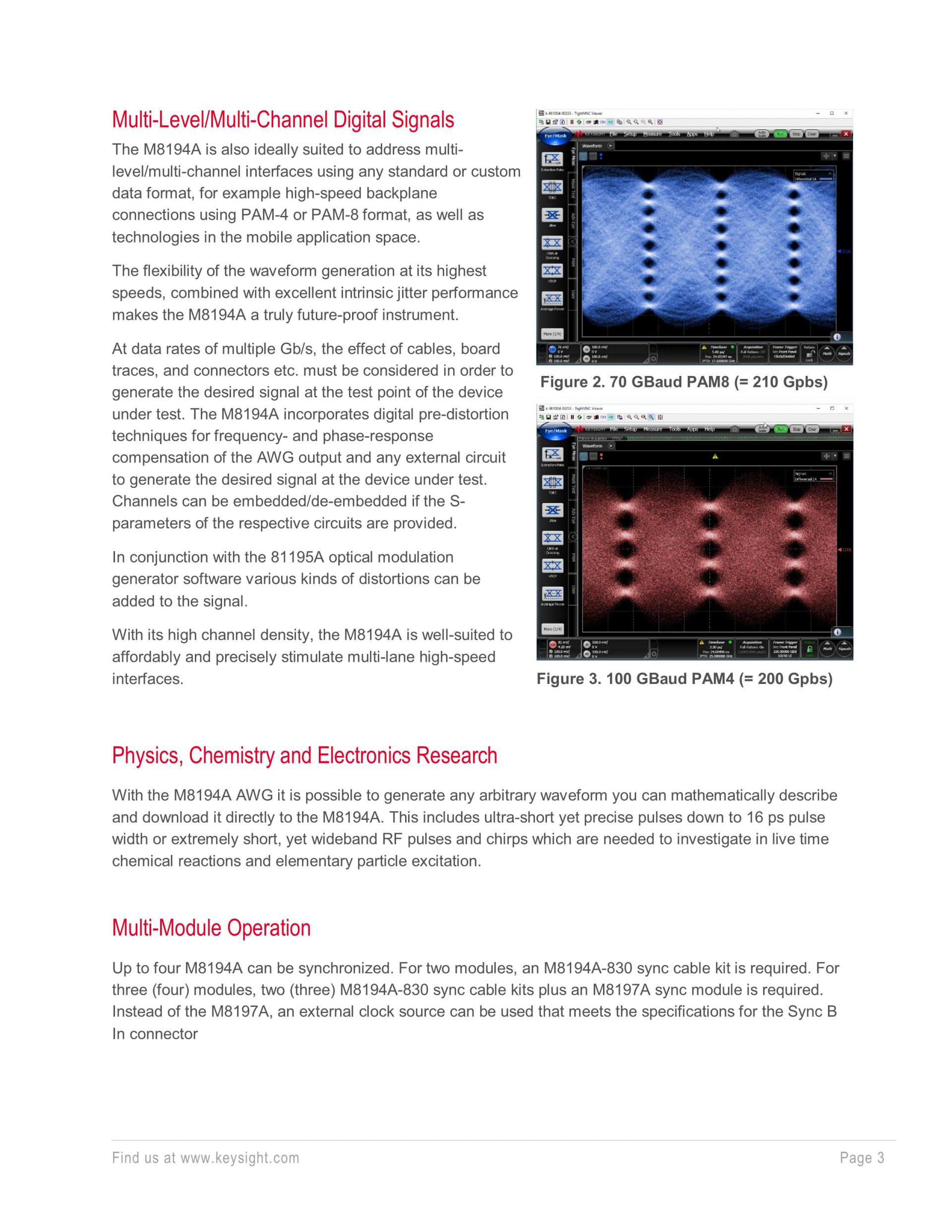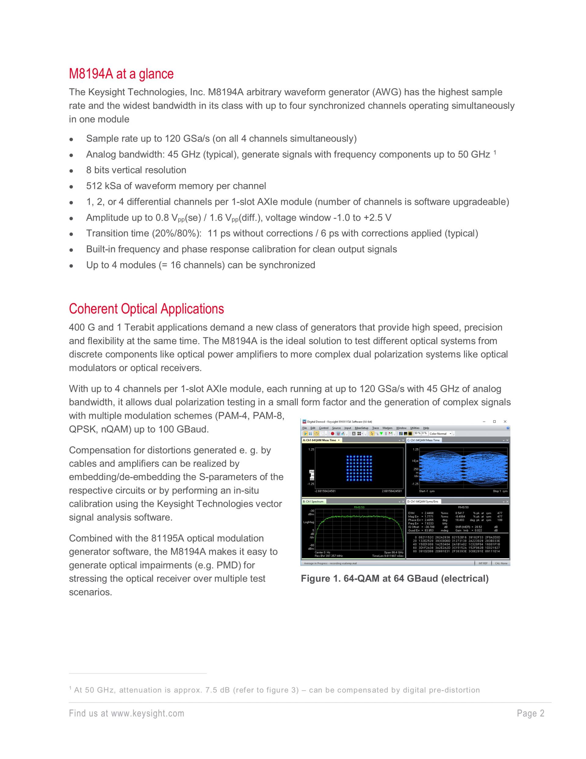 M8194A는 64 GBd/64 QAM 및 100 GBd PAM4 요구 사항을 충족하도록 설계되어 코히어런트 광학 및 멀티레벨/멀티채널 디지털 신호 요구 사항을 충족합니다. M8194A는 키사이트의 고속 AWG 중 하나로, 120 GSa/s 및 최대 50 GHz 대역폭을 지원합니다. M8194A는 싱글채널 또는 멀티채널 작업 시 간편성과 유연성을 제공합니다.
