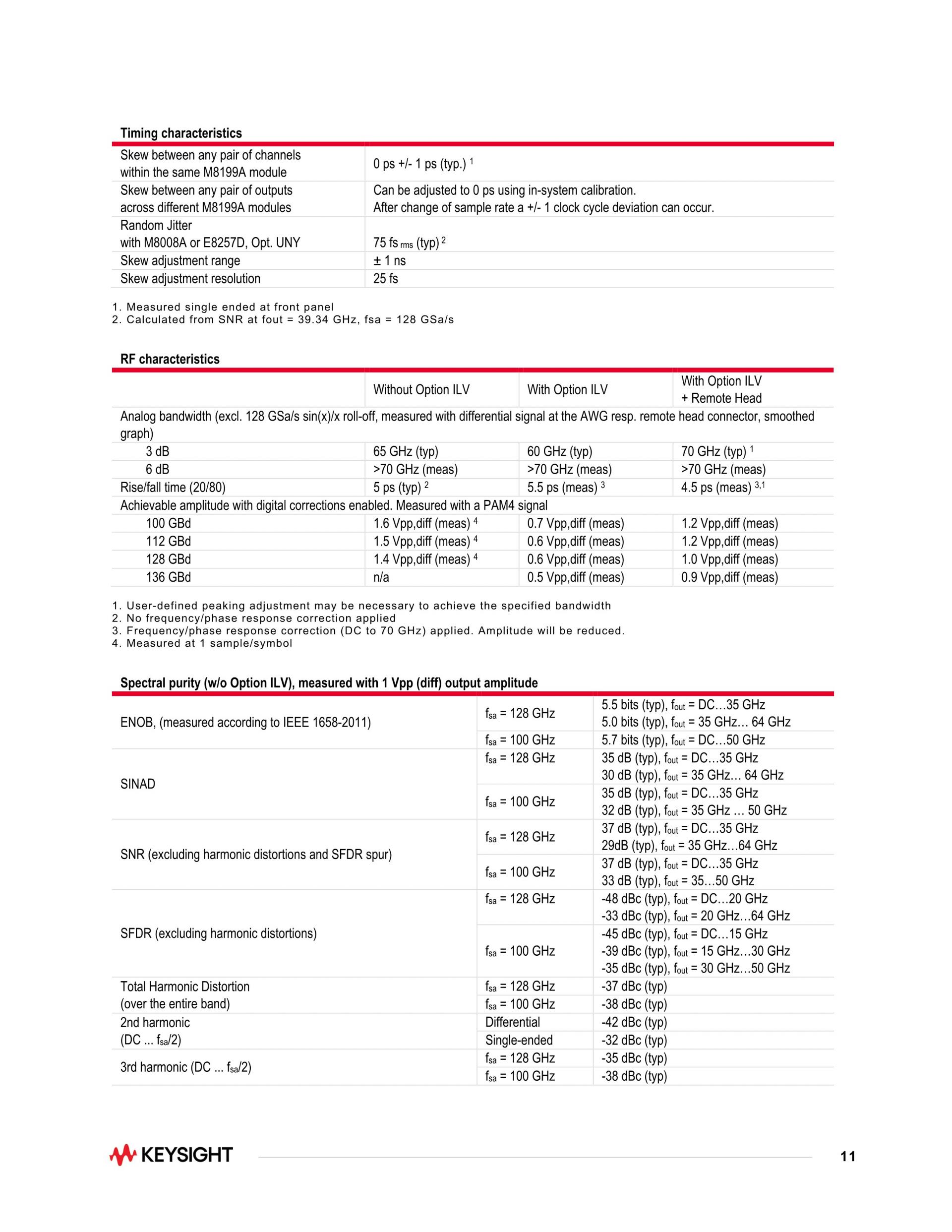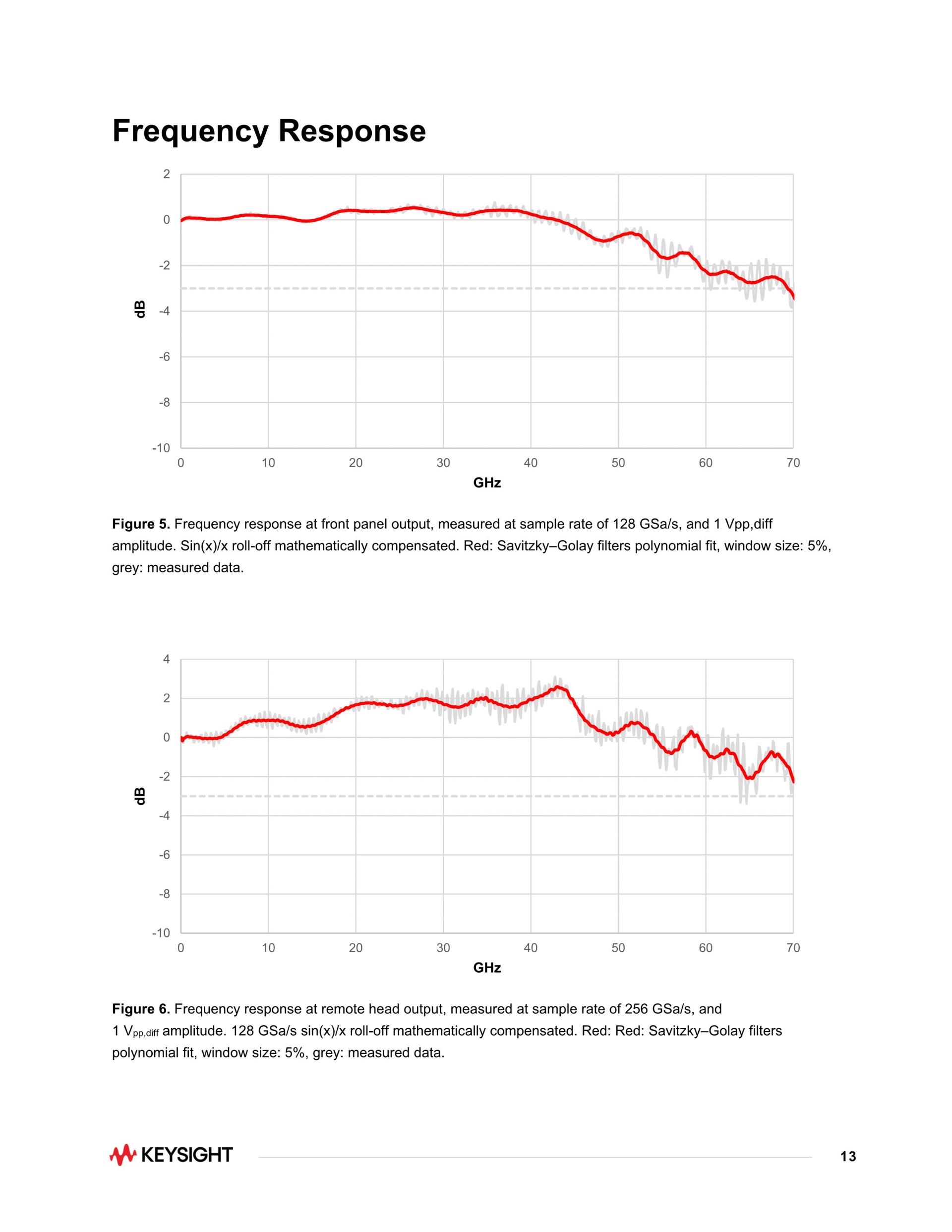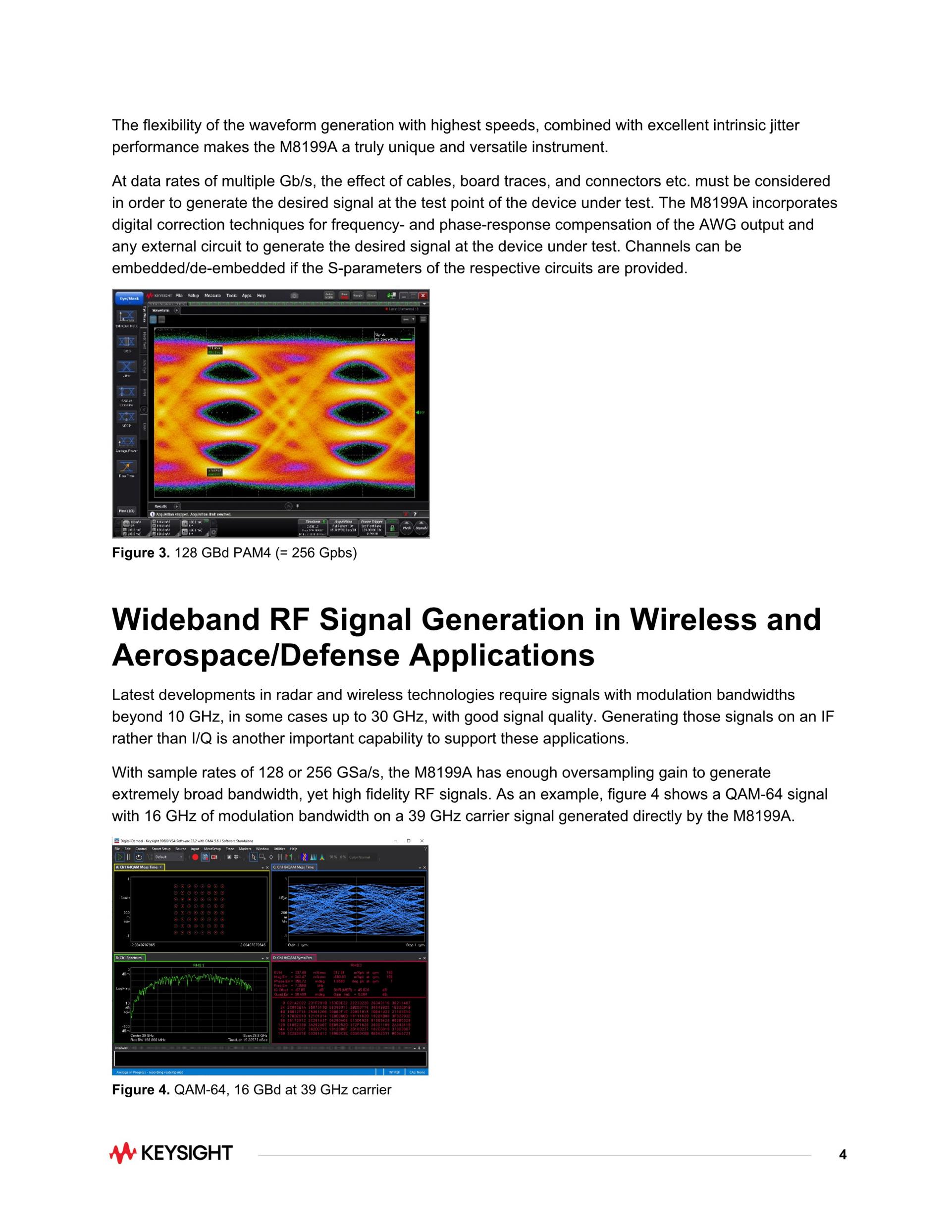 키사이트의 M8199A 임의 파형 생성기(AWG)는 4개 채널(128 GSa/s) 또는 2개 채널(256 GSa/s)을 갖추었으며 최대 70 GHz의 공칭 아날로그 대역폭을 지원합니다.