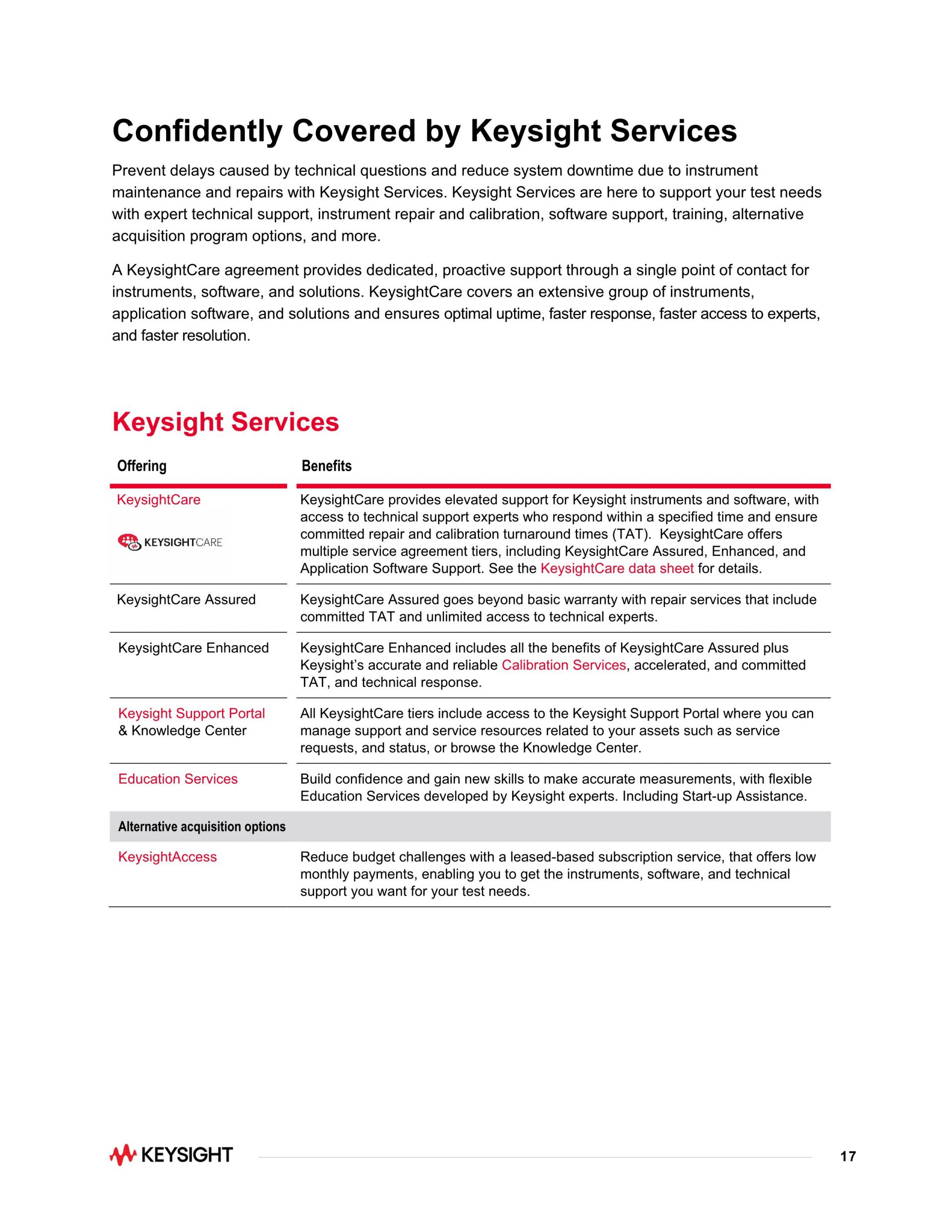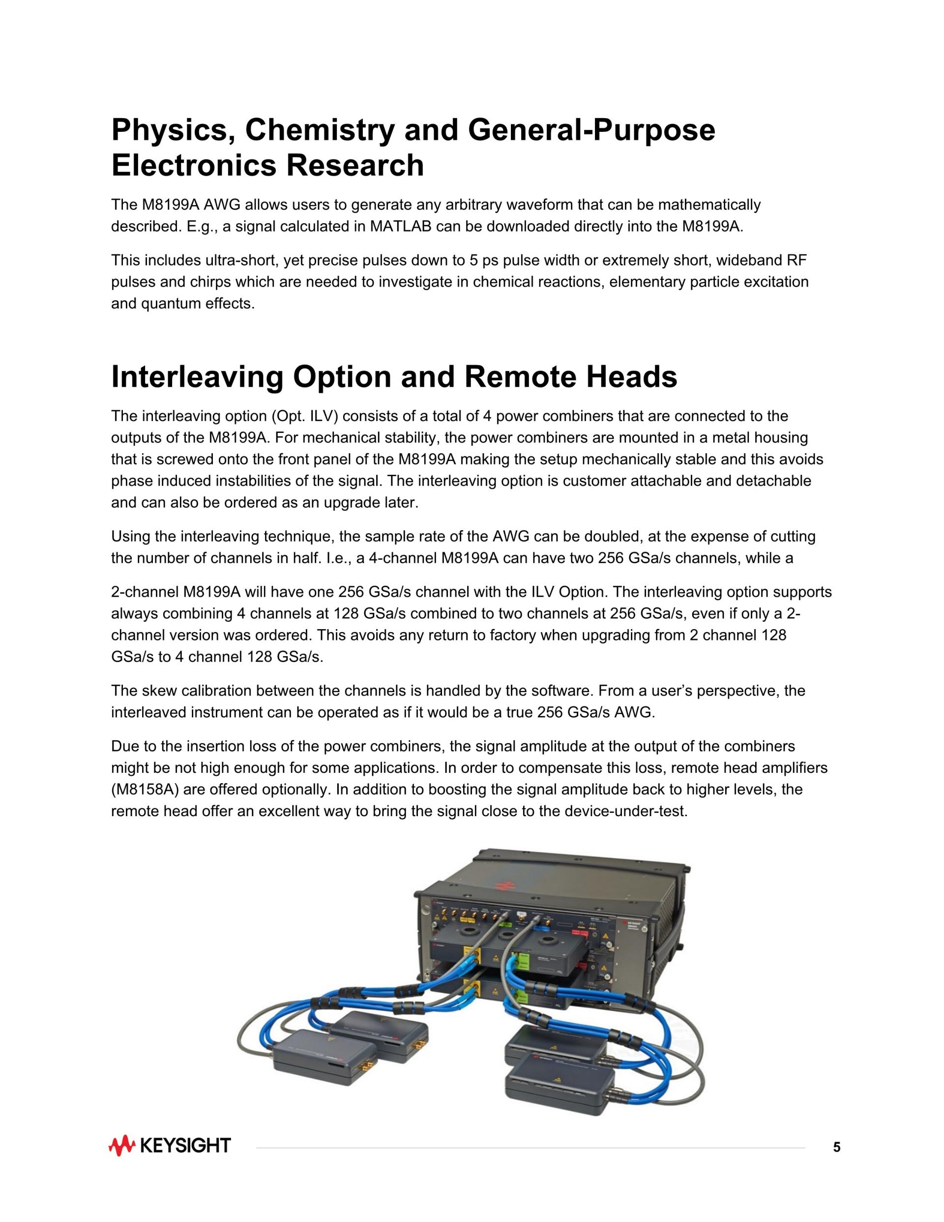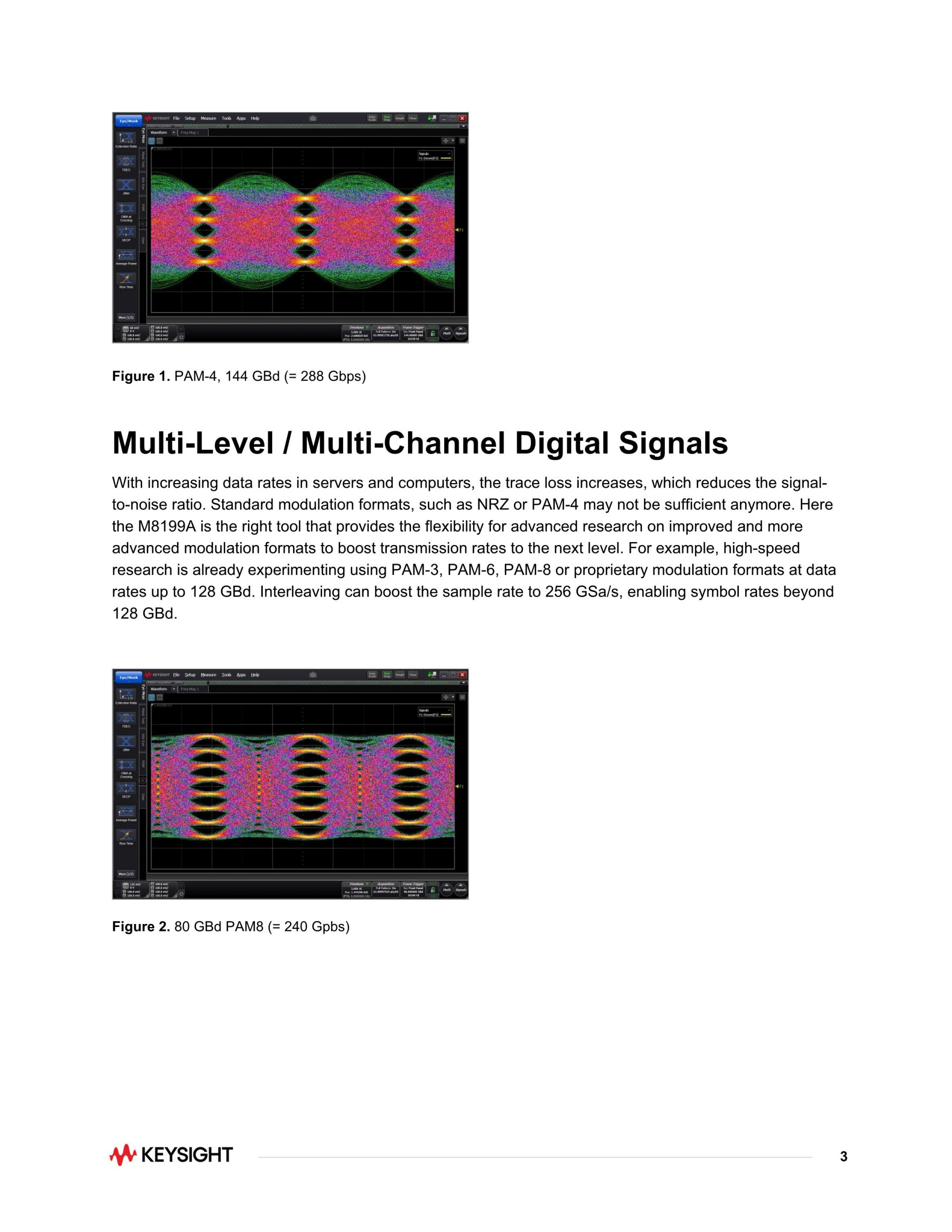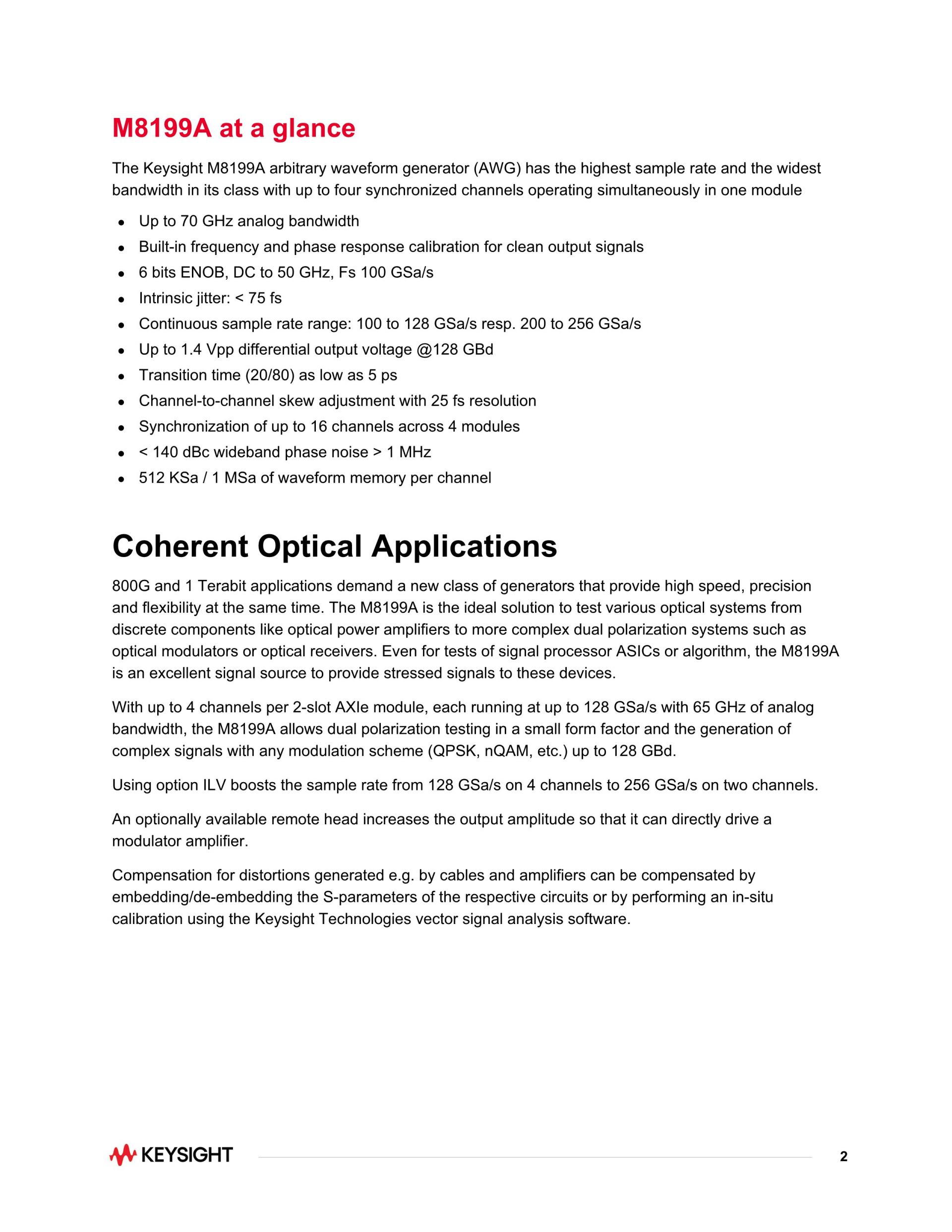 - 키사이트의 M8199A 256 GSa/s AWG는 50% 이상 더 큰 아날로그 대역폭과 함께 현재 시장에 출시된 어떤 AWG보다 두 배 빠른 샘플링 속도를 제공합니다. 따라서 연구 엔지니어들은 테라비트 송신 시스템용 첨단 콤포넌트를 빠르게 개발할 수 있습니다.