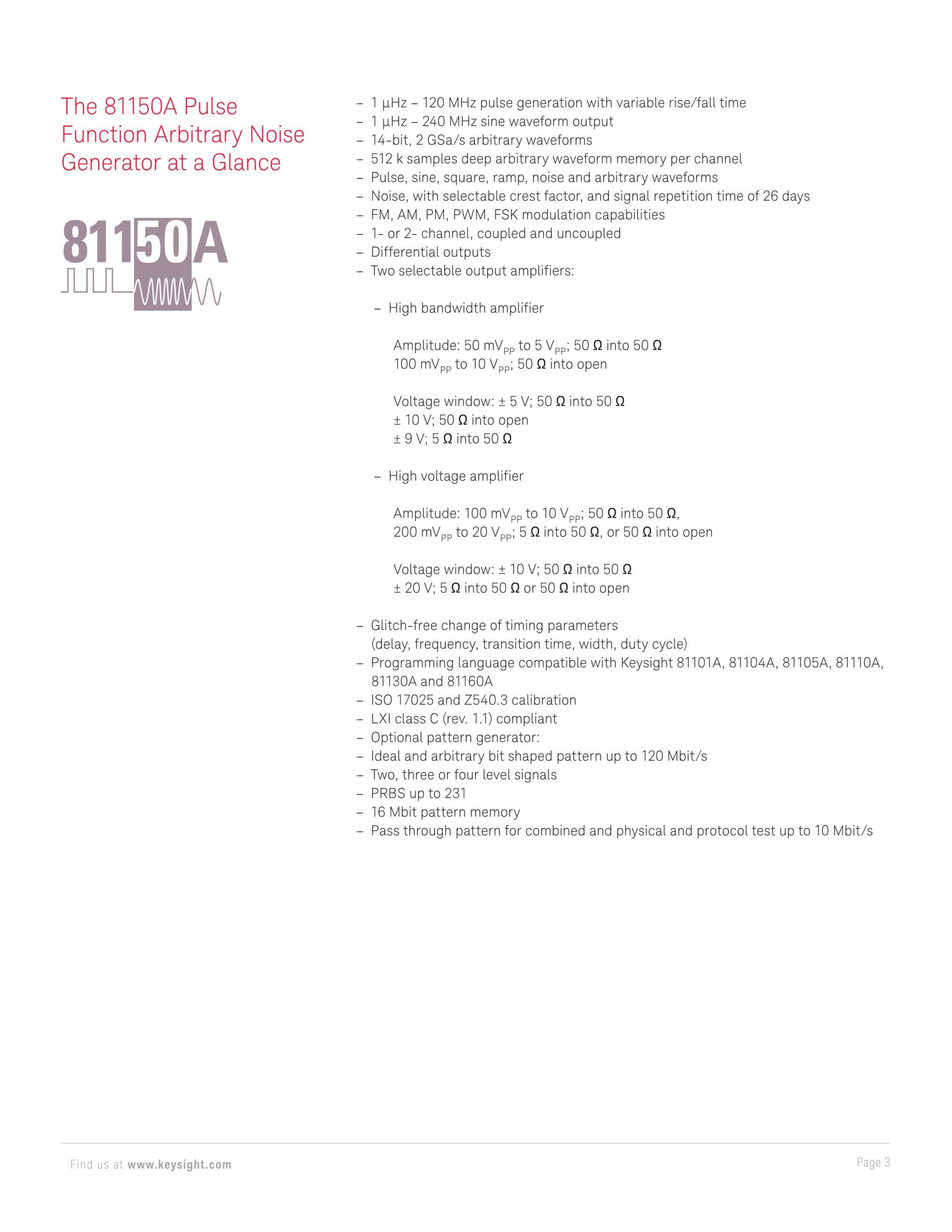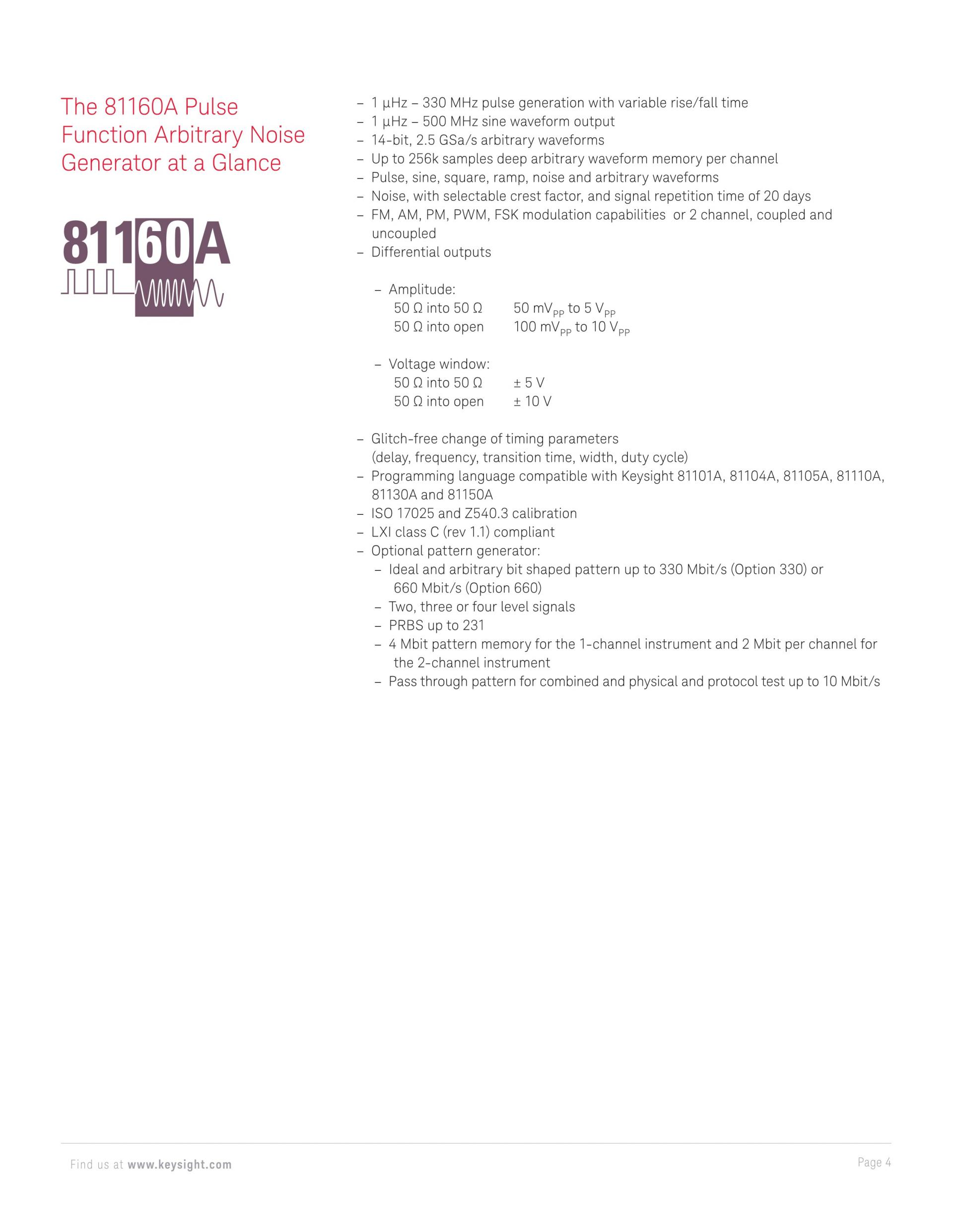 키사이트 81160A 펄스 함수 임의 노이즈 생성기는 차세대 실험실 표준으로, 설계 또는 테스트 대상 디바이스에 대한 빠르고 정확한 통찰력을 제공하며 이상적인 실제 테스트를 가속화할 수 있는 필수 장비입니다.