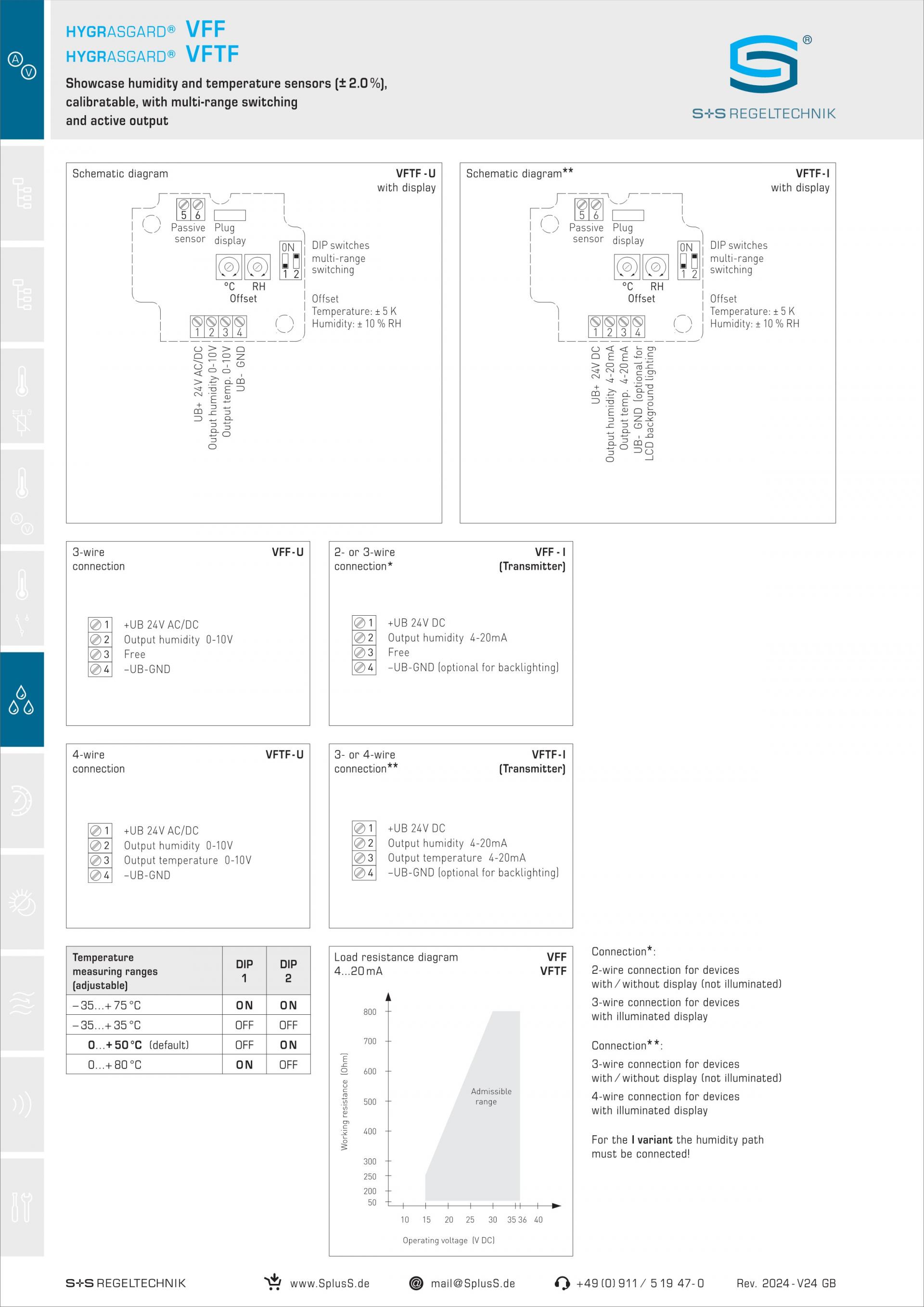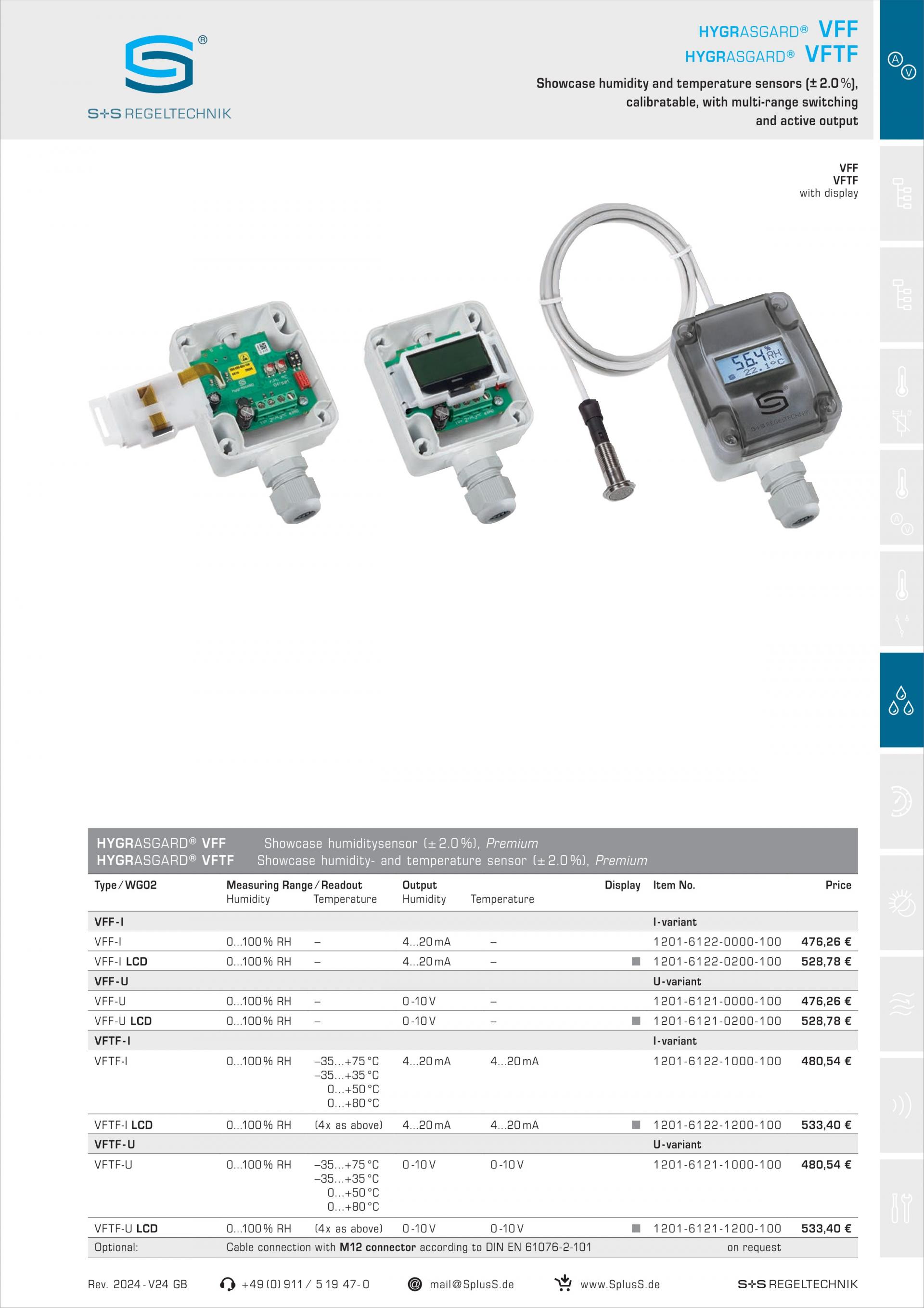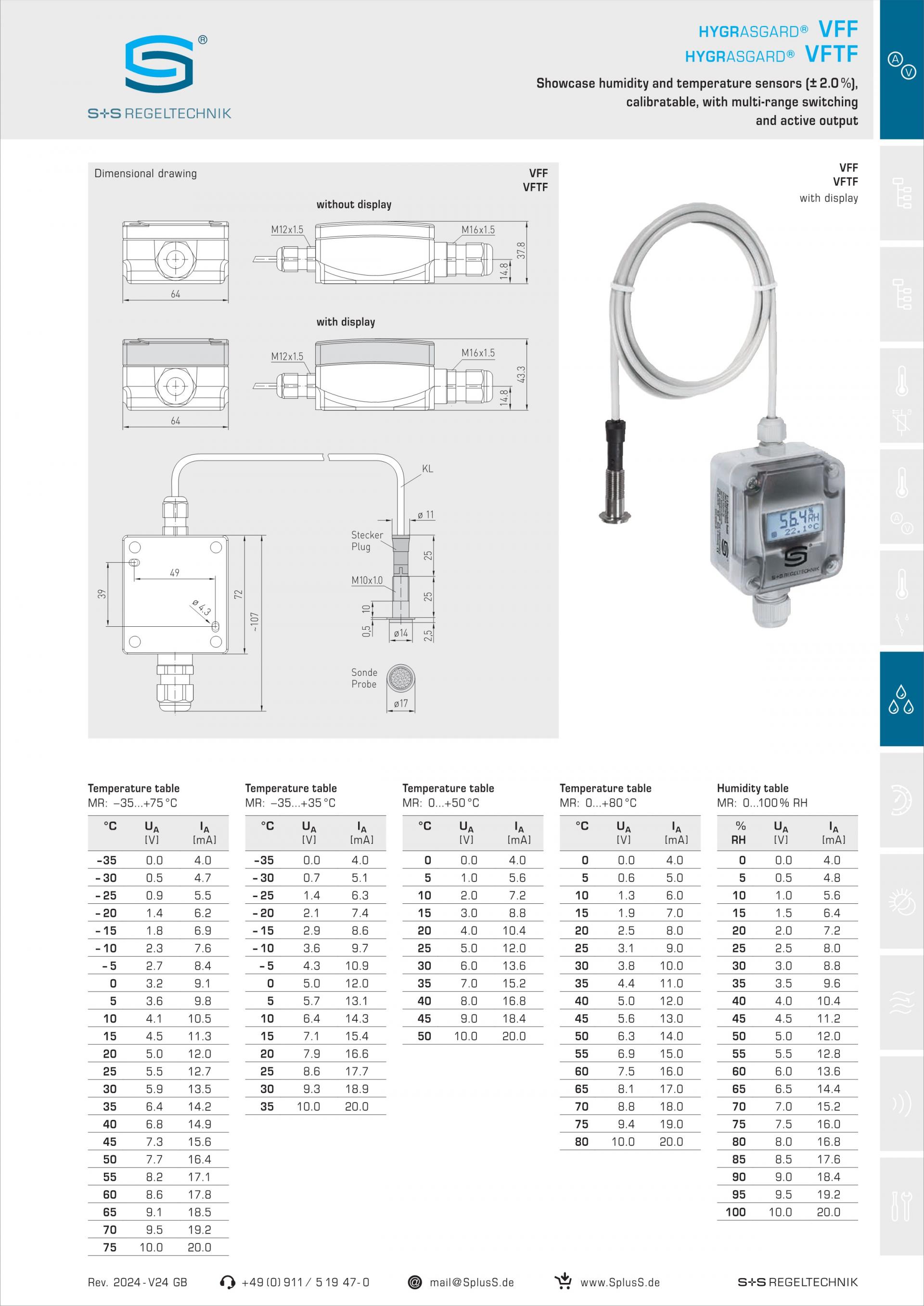 교정 가능한 HYGRASGARD® VFF / VFTF 습도 및 온도 트랜스미터는 공기의 상대 습도와 온도를 측정합니다. 습도 및 온도 측정치를 0-10V 또는 4...20mA의 표준 신호로 변환하며 옵션 디스플레이 유무에 관계없이 사용할 수 있습니다. 센서 장치는 4가지 전환 가능한 온도 범위를 지원합니다. 상대 습도(%rH)는 수증기 부분압을 해당 가스 온도의 포화 증기압으로 나눈 몫입니다.