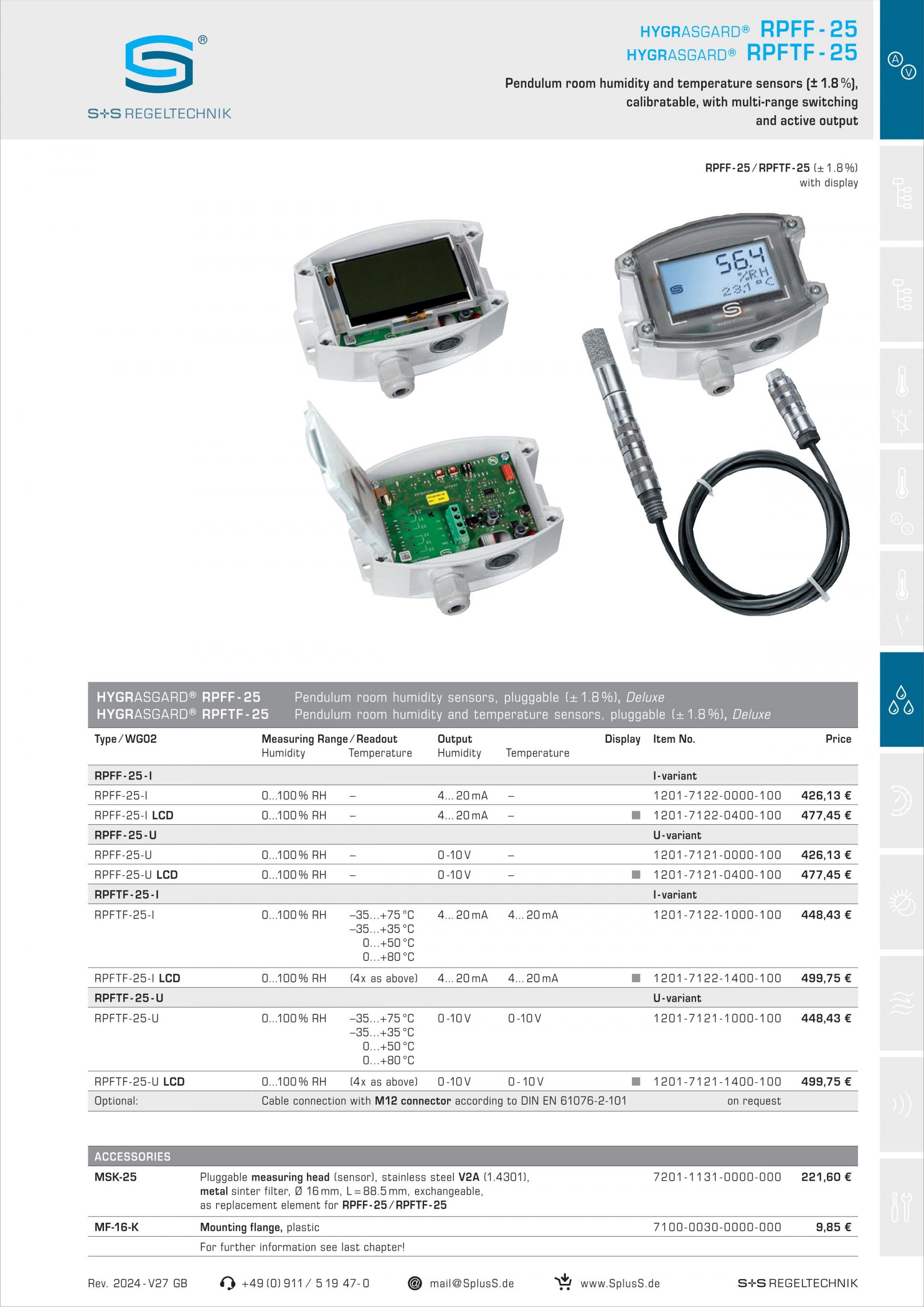 S+S RPFTF-25-I 실내 진자 습도 및 온도 센서