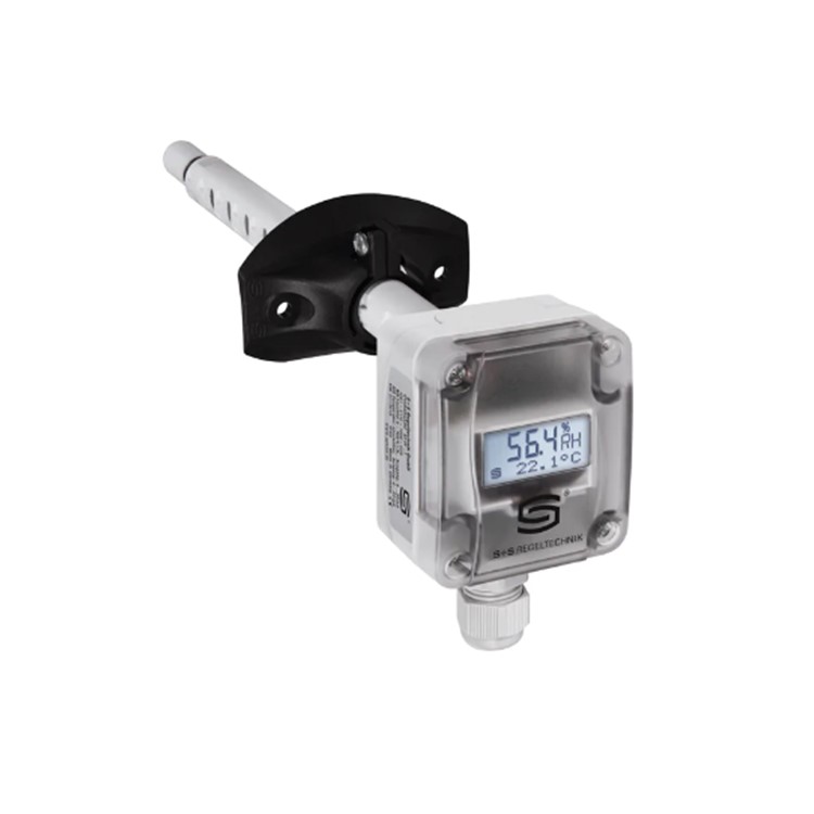 교정 가능한 HYGRASGARD® KFF - SD / KFTF - SD 덕트 습도/온도 센서(±2.0%), 플라스틱 소결 필터 포함(금속 소결 필터 옵션), 스냅온 커버가 있는 충격 방지 플라스틱으로 제작된 하우징.