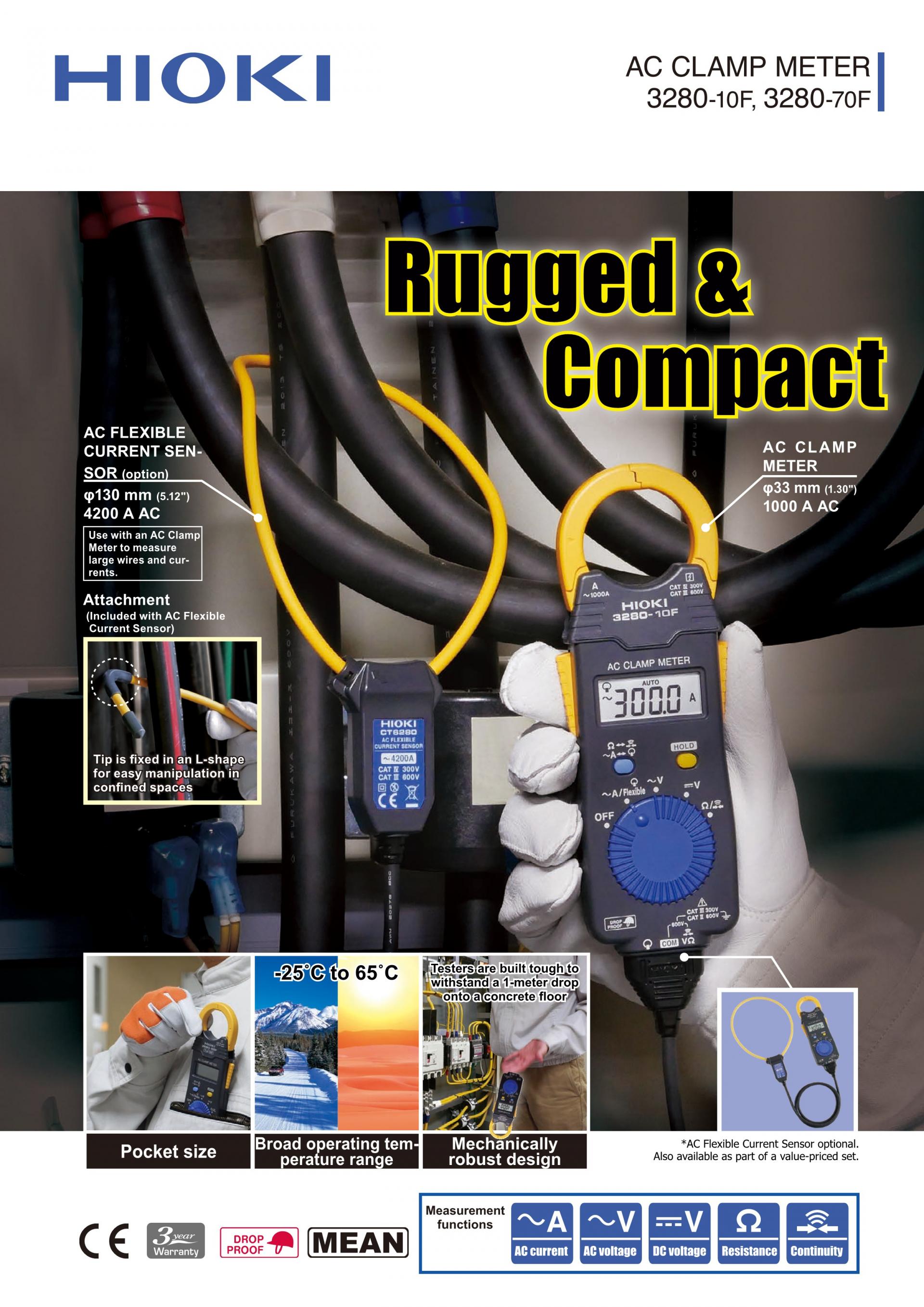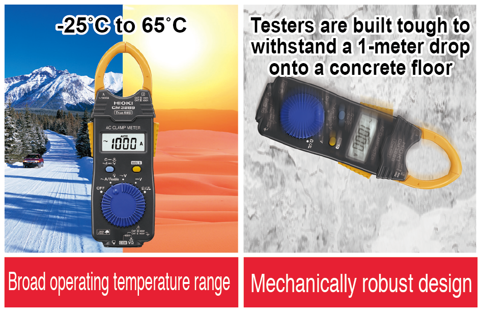 낙하에 강하고 단단한 포켓 클램프 미터가볍고 소형이면서 사용 온도 환경 -25 -〜65℃, 콘크리트 위 1m 낙하 내구 사양. 거친 환경에서도 사용하실 수 있습니다. | ![]() |