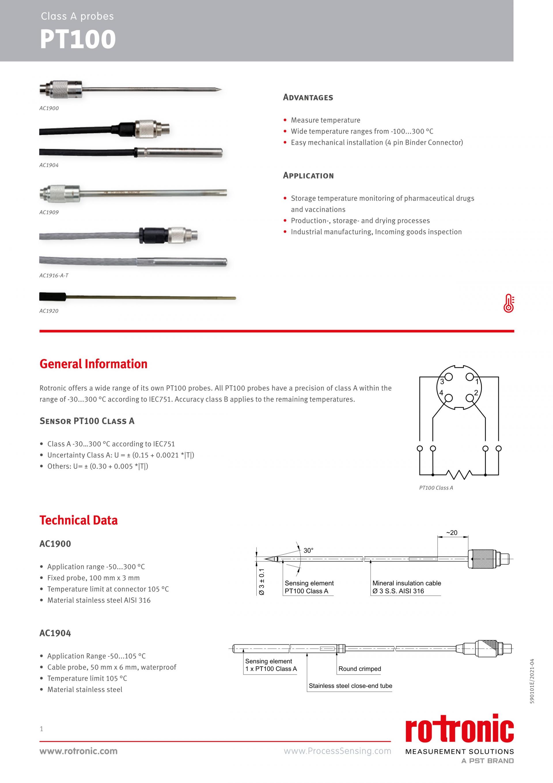 Rotronic은 광범위한 자체 PT100 프로브를 제공하지만 다른 4선 온도 프로브도 사용할 수 있습니다. 모든 PT100 프로브는 IEC751에 따라 -30°C~300°C 범위 내에서 클래스 A의 정밀도를 갖습니다. 정확도 등급 B는 나머지 온도에 적용됩니다.