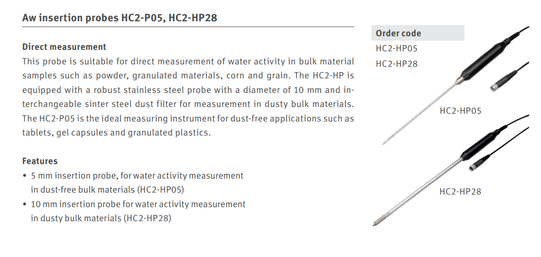 삽입 프로브는 벌크 재료, 벽돌, 콘크리트 등의 측정에 적합합니다. 습도와 온도를 측정하고 이슬점/서리점을 계산합니다. 10mm 삽입 프로브: 밀가루, 설탕 등과 같은 먼지가 많은 벌크 재료 측정