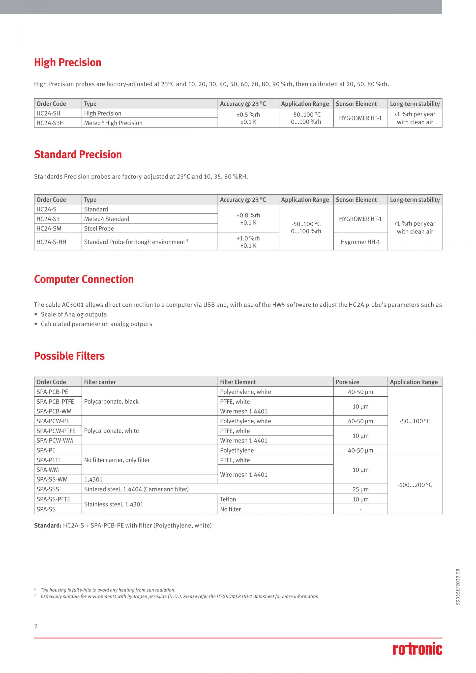 표준 Rotronic 습도 및 온도 프로브는 -50~100 °C / 0~100 %RH의 온도 범위에서 사용할 수 있습니다. ± 0.8%RH / ± 0.1°C의 뛰어난 정확도를 제공합니다. 교정을 위해 가동 중단 시간 없이 프로브를 교체할 수 있습니다. Rotronic HF5, PF4/5 트랜스미터 또는 HP32와 함께 HC2A-SM 프로브는 다양한 응용 분야에서 가장 먼저 선택됩니다.