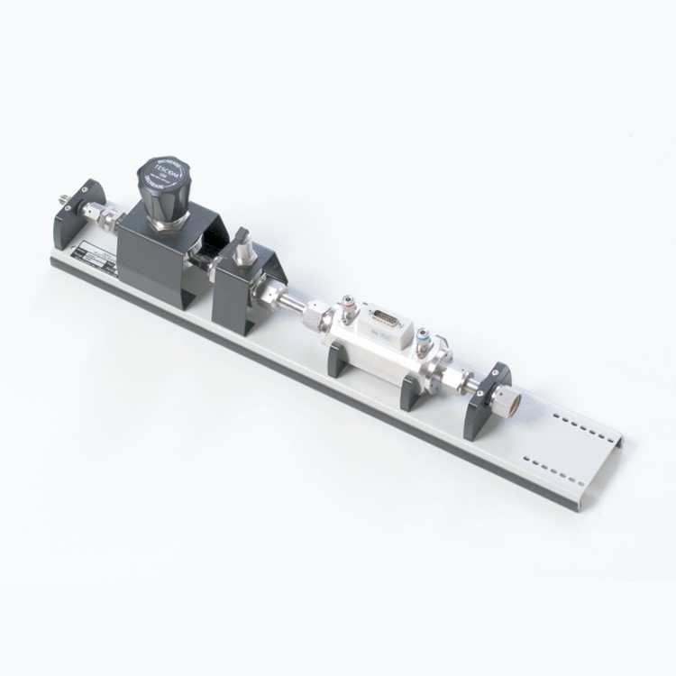 특수 크래들이 molbloc을 지원합니다. MFC(질량 유량 컨트롤러) · 테스트 중인 다른 장치 또는 수동 유량 제어를 위한 선택적 미터링 밸브 키트를 장착하기 위한 연결 및 패드가 molbloc의 다운스트림에 제공됩니다.
