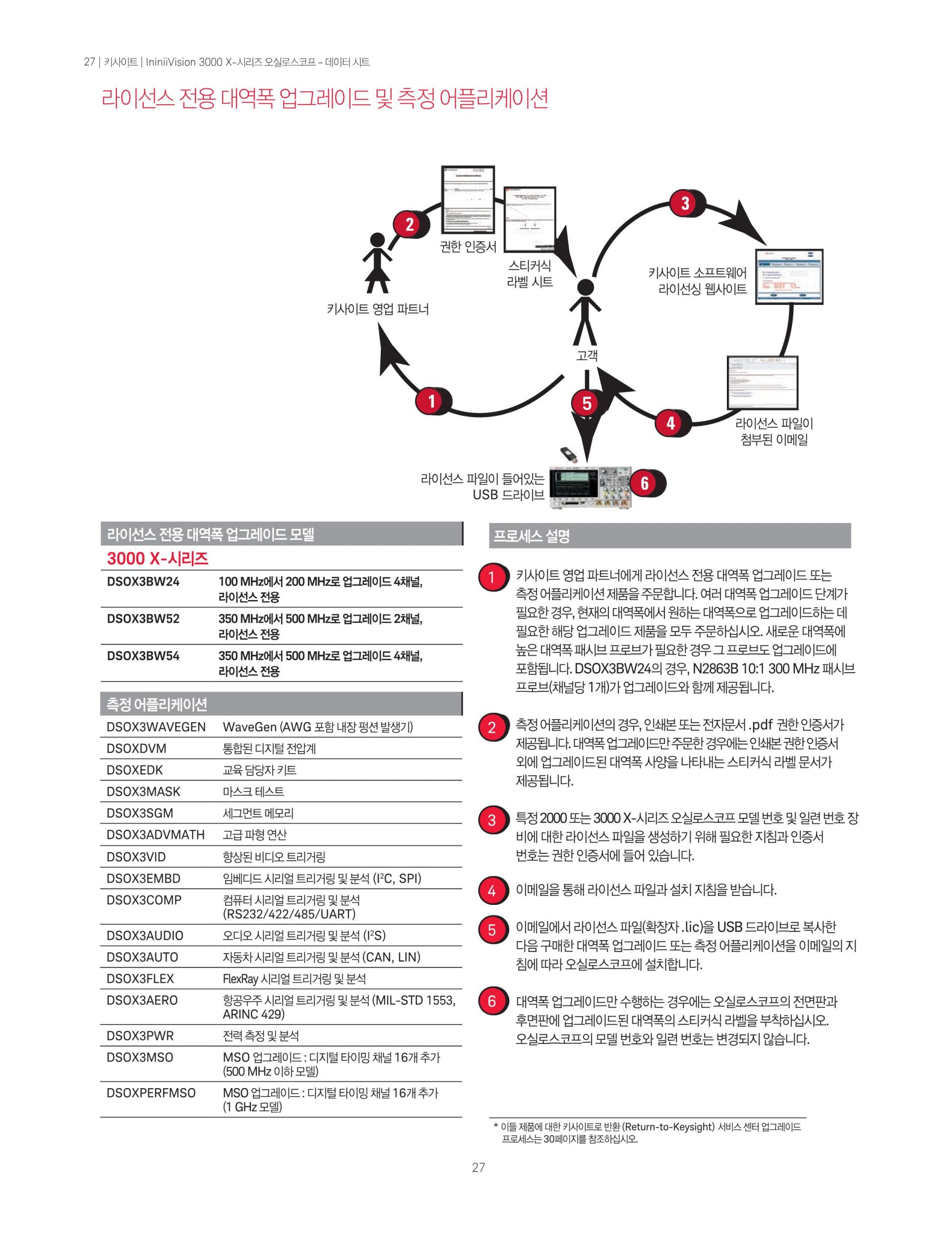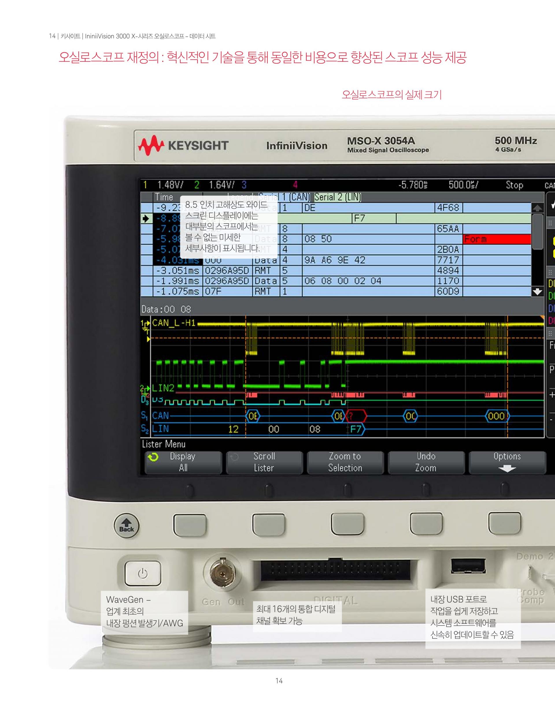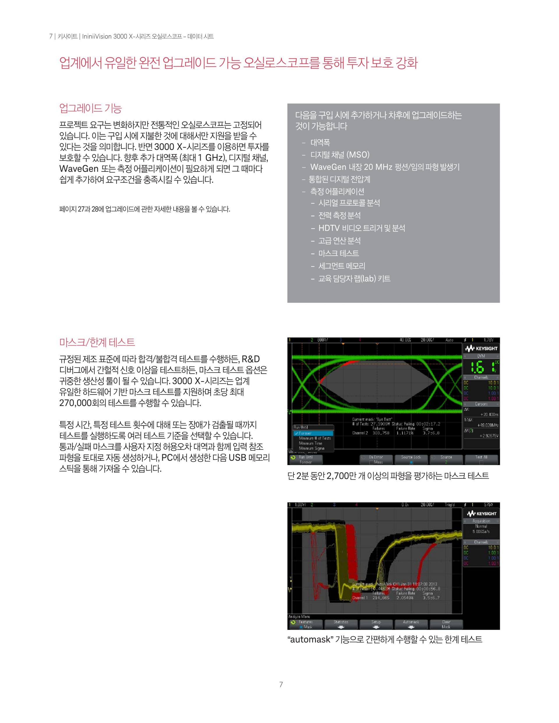 - 완전한 업그레이드의 용이성으로 측정 성능 확장: 메모리, 디지털 채널, 20 MHz 임의 파형 발생기(WaveGen), 3디지트 전압계, 시리얼 트리거 및 분석, 세그먼트 메모리 그리고 마스크 테스트 기능을 언제든지 추가