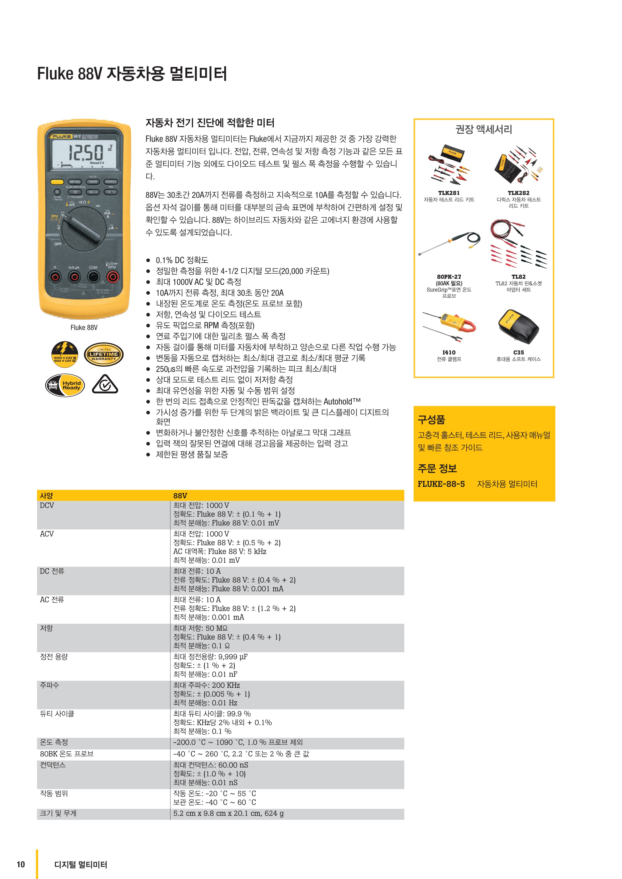 Fluke 88V는 향상된 측정 기능, 문제 해결 기능 및 정확도로 기존 및 하이브리드 자동차의 더 많은 문제를 해결합니다. 88V는 Fluke에서 지금까지 제공한 것 중 가장 강력한 자동차용 멀티미터입니다. 전압, 전류, 연속성 및 저항 측정 기능과 같은 모든 표준 멀티미터 기능 외에도 다이오드 테스트 및 펄스 폭 측정을 수행할 수 있습니다.