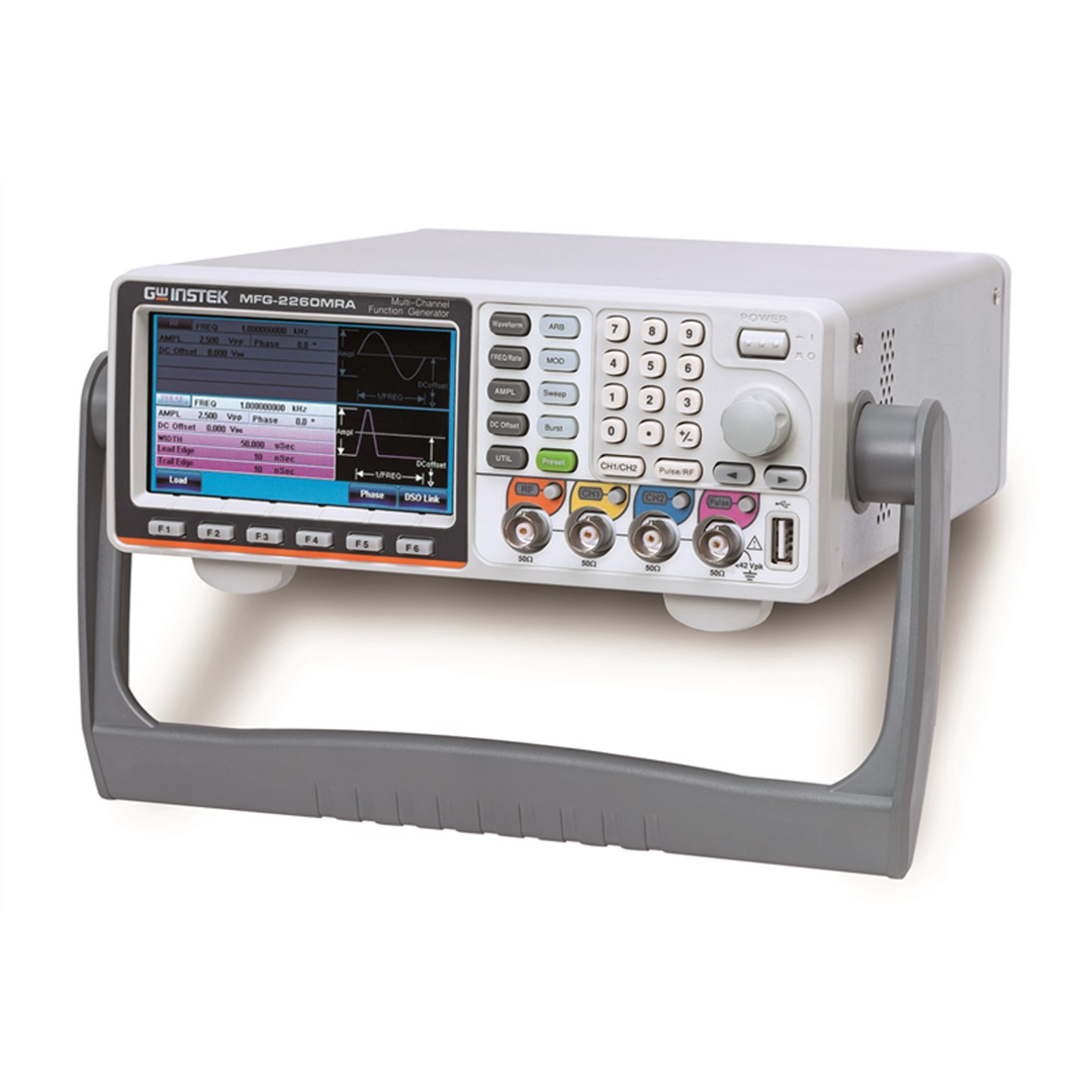 MFG-2000 series, which has up to 5 simultaneous output channels (MFG-2260MFA/MFG-2260MRA), including CH1 and CH2 equivalent performance dual channel arbitrary function generator with the maximum 60MHz for both channels; RF signal generator, a standard AFG, which produces the maximum 320MHz sine wave and various modulation RF signals; pulse generator, whose frequency reaches 25MHz; power amplifier, which is ideal for audio range. The above-mentioned five different functionality channels are separately or totally allocated on 10 models, which extend from the basic single-channel AFG with pulse generator models to five-channel models so as to satisfy various educational and industrial applications.