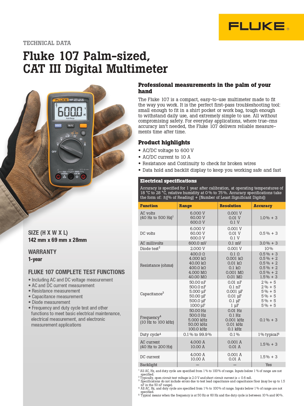 - Fluke 107 Palm-sized, CAT III Digital Multimeter