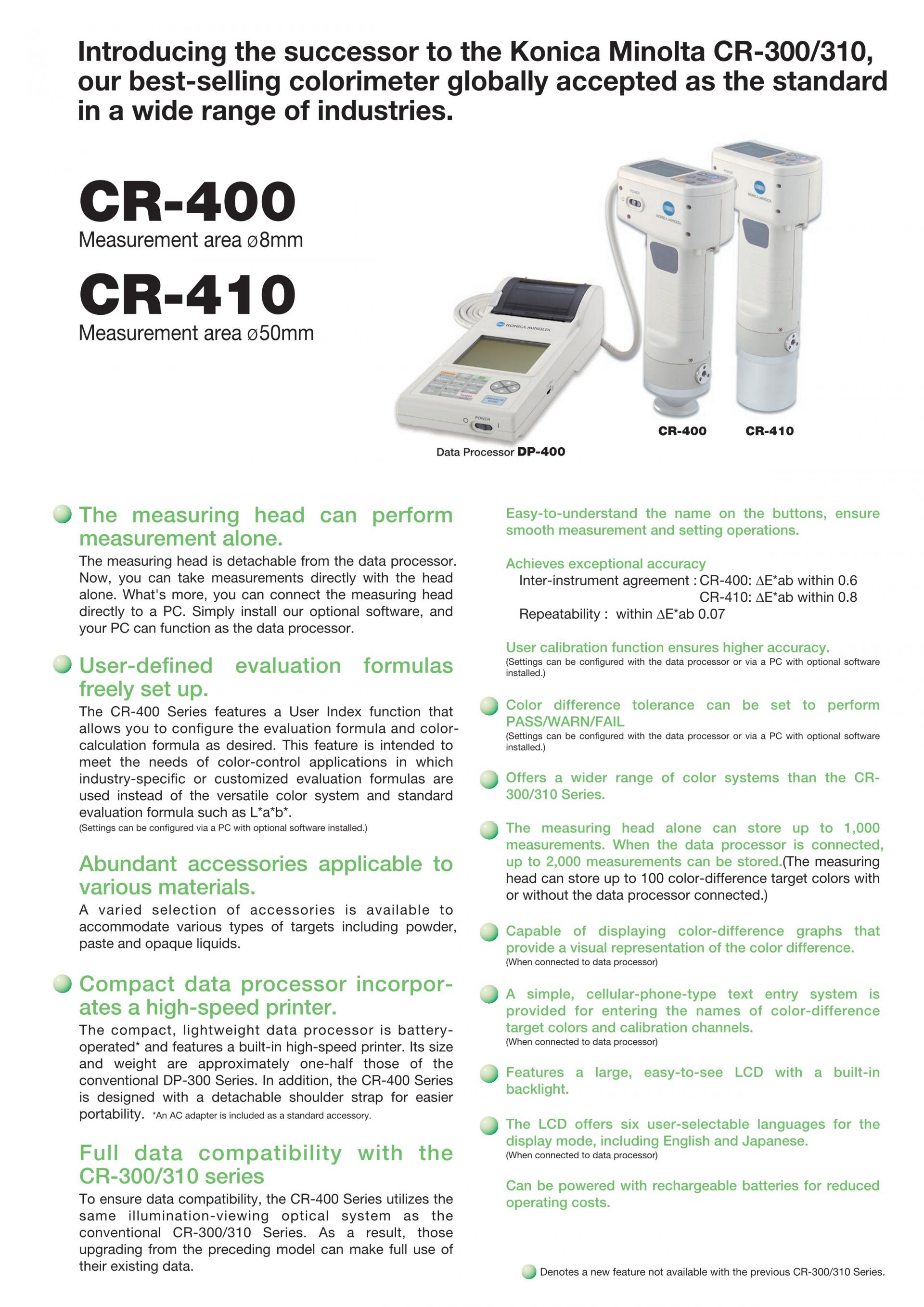 조명 수광 광학계는 기존의 CR-300/310과 동일하여 데이터 호환이 가능하므로, CR-300/310을 사용하시는 분들도 과거 데이터를 그대로 사용하실 수 있습니다.