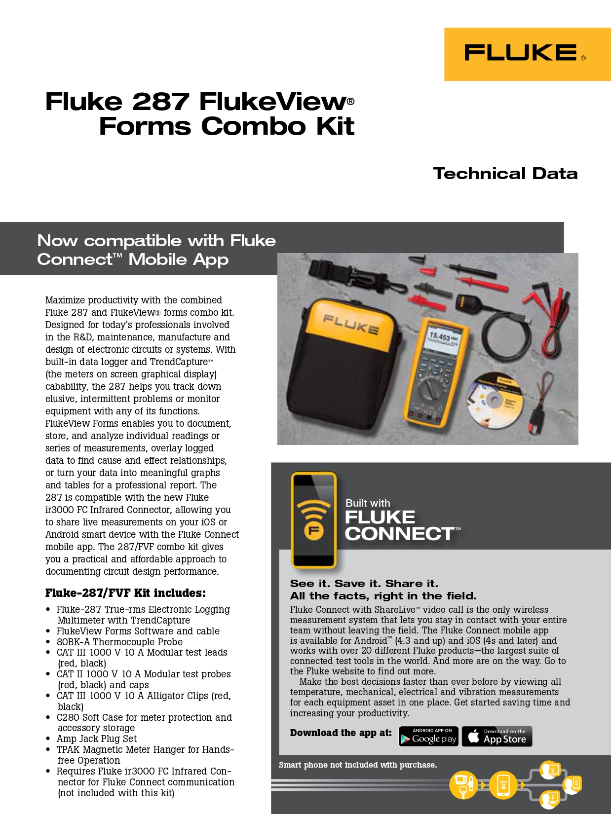 - NEW – Now compatible with Fluke Connect mobile app and all Fluke FC enabled test tools with optional ir3000 FC infrared connector (sold separately).