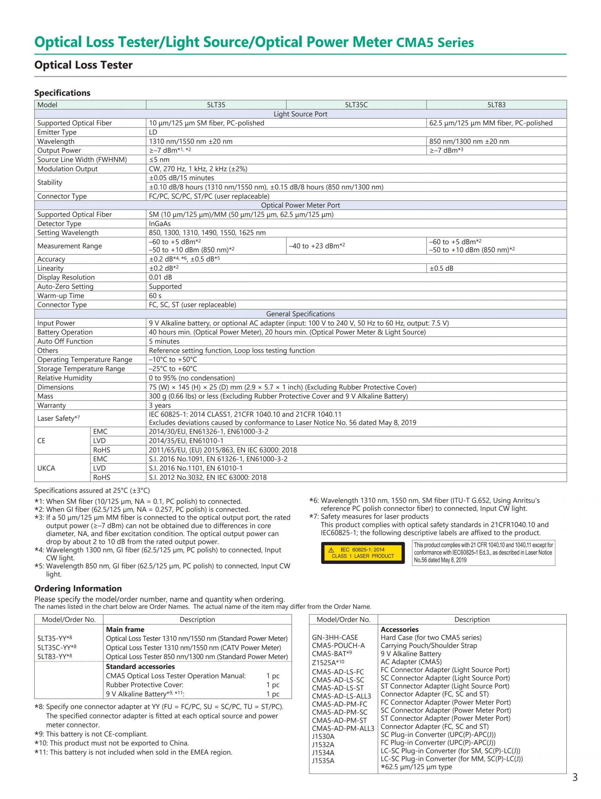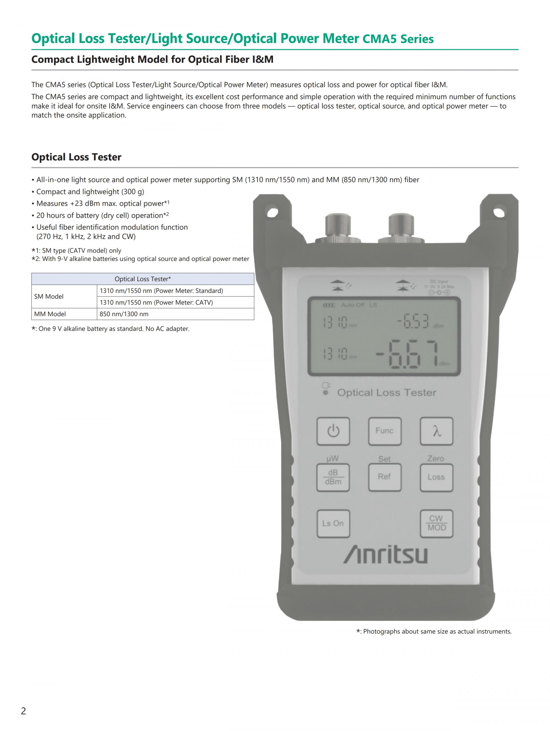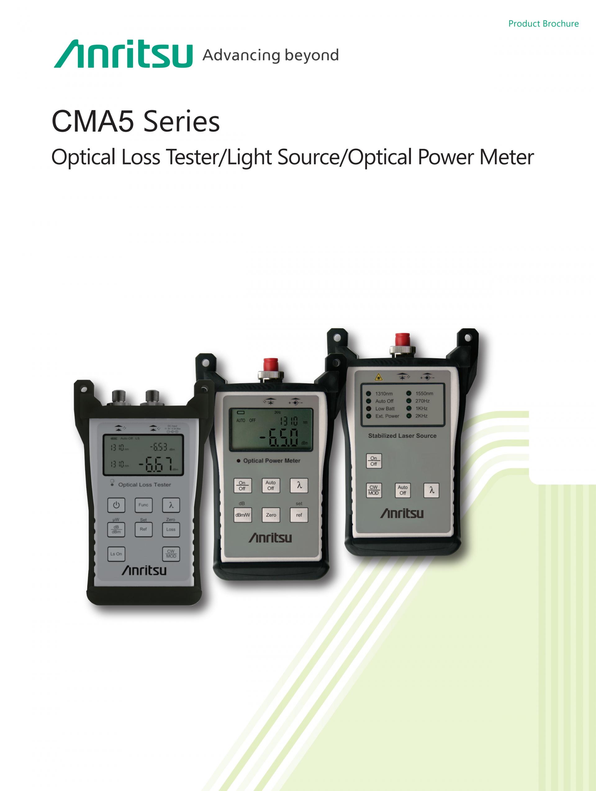CMA5 시리즈(광원/광 파워 미터)는 MM 및 SM 파이버 설치에서 사용되는 광 파워 및 파장 손실 측정을 지원합니다.