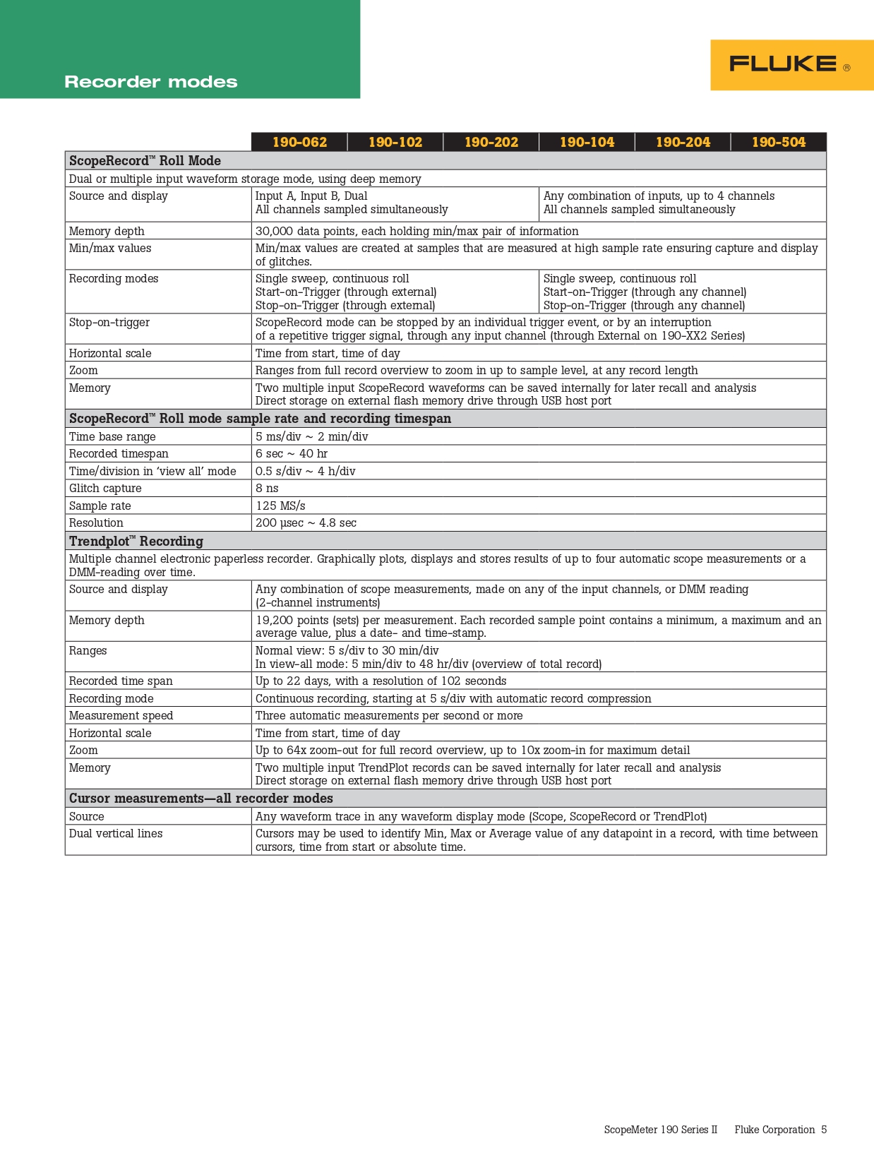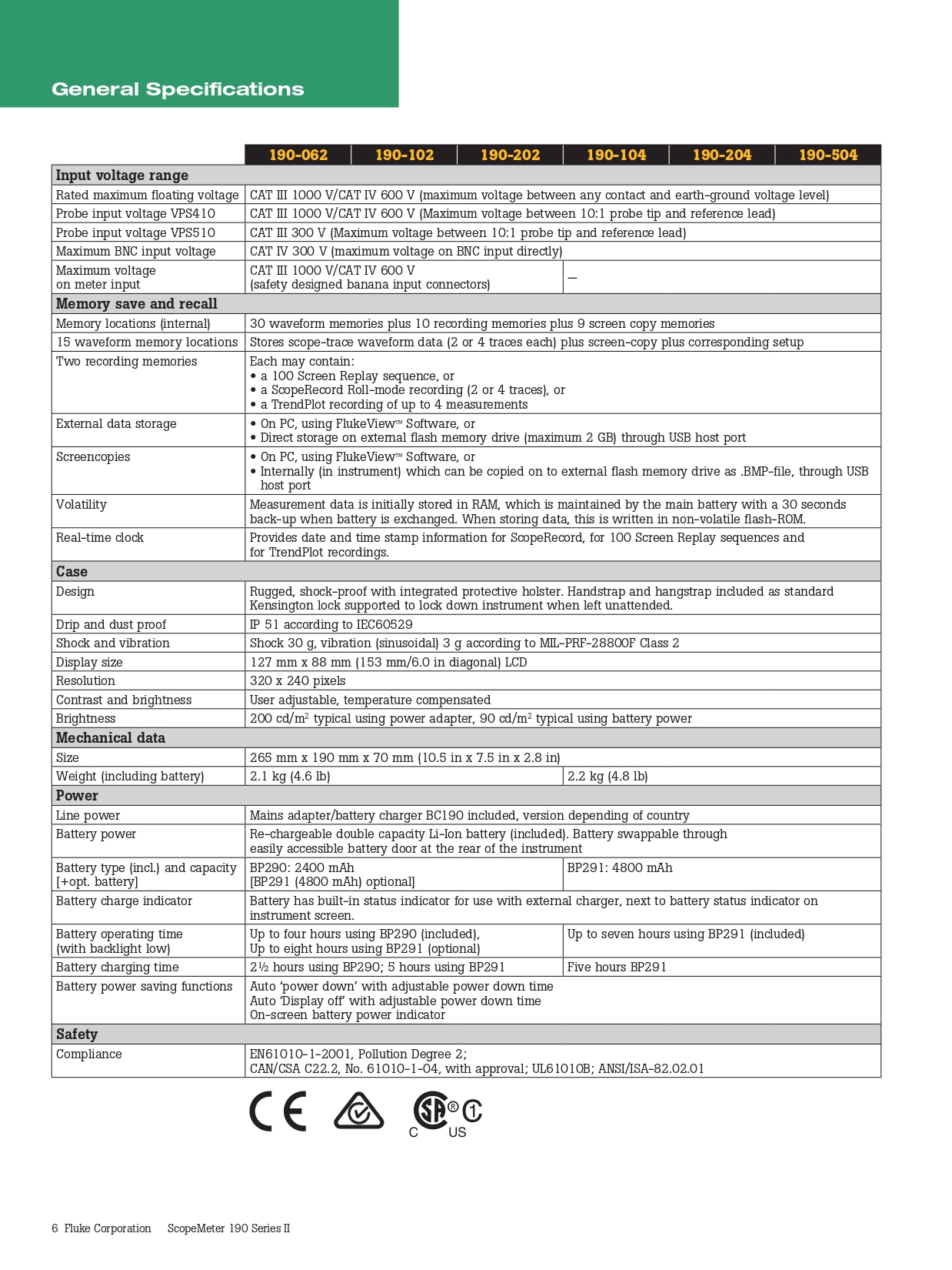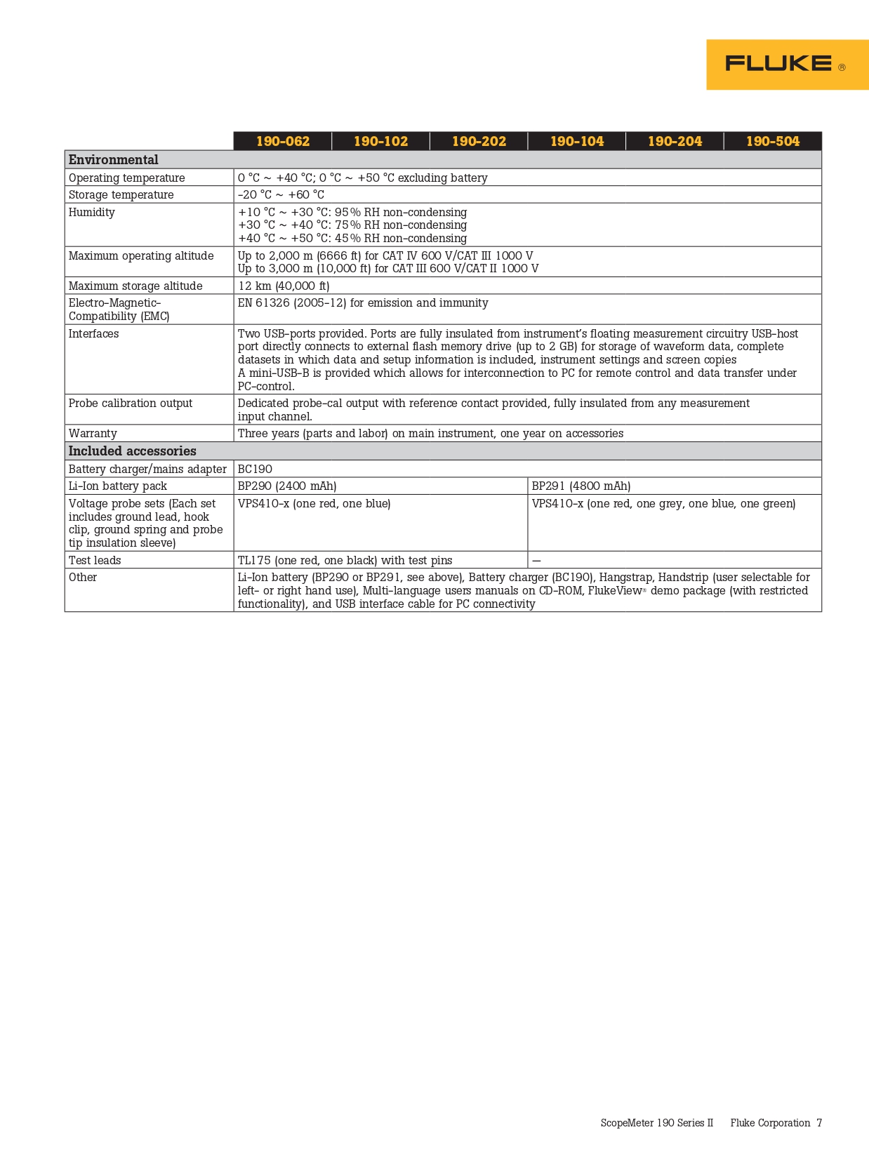 제품 사양: Fluke 190-204 ScopeMeter® 테스트 장비