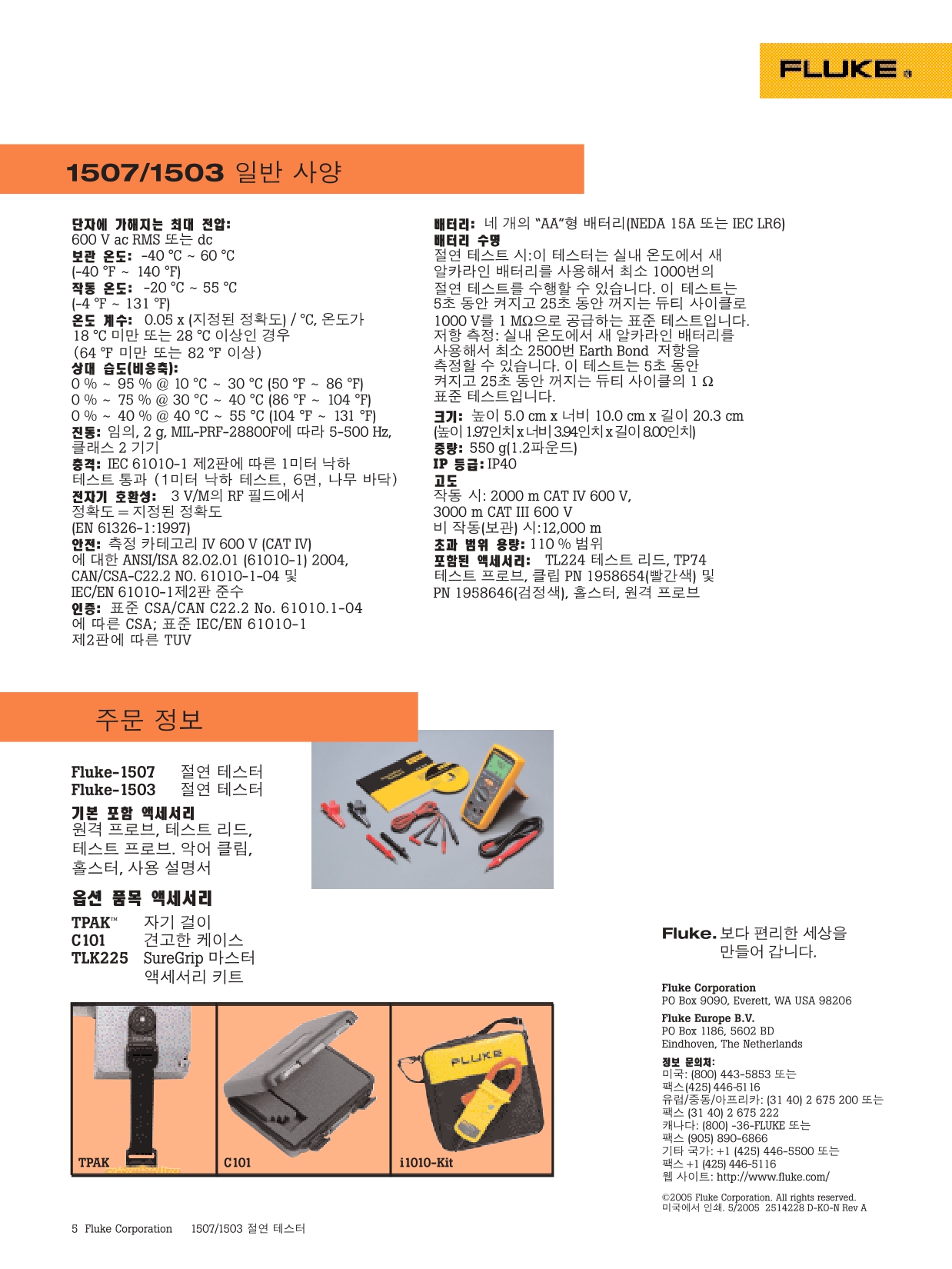 | 포함 부속품 | TL224 테스트 리드, TP74 테스트 프로브, 클립 PN 1958654(빨간색) 및 PN 1958646(검정색), 홀스터, 원격 프로브 | |