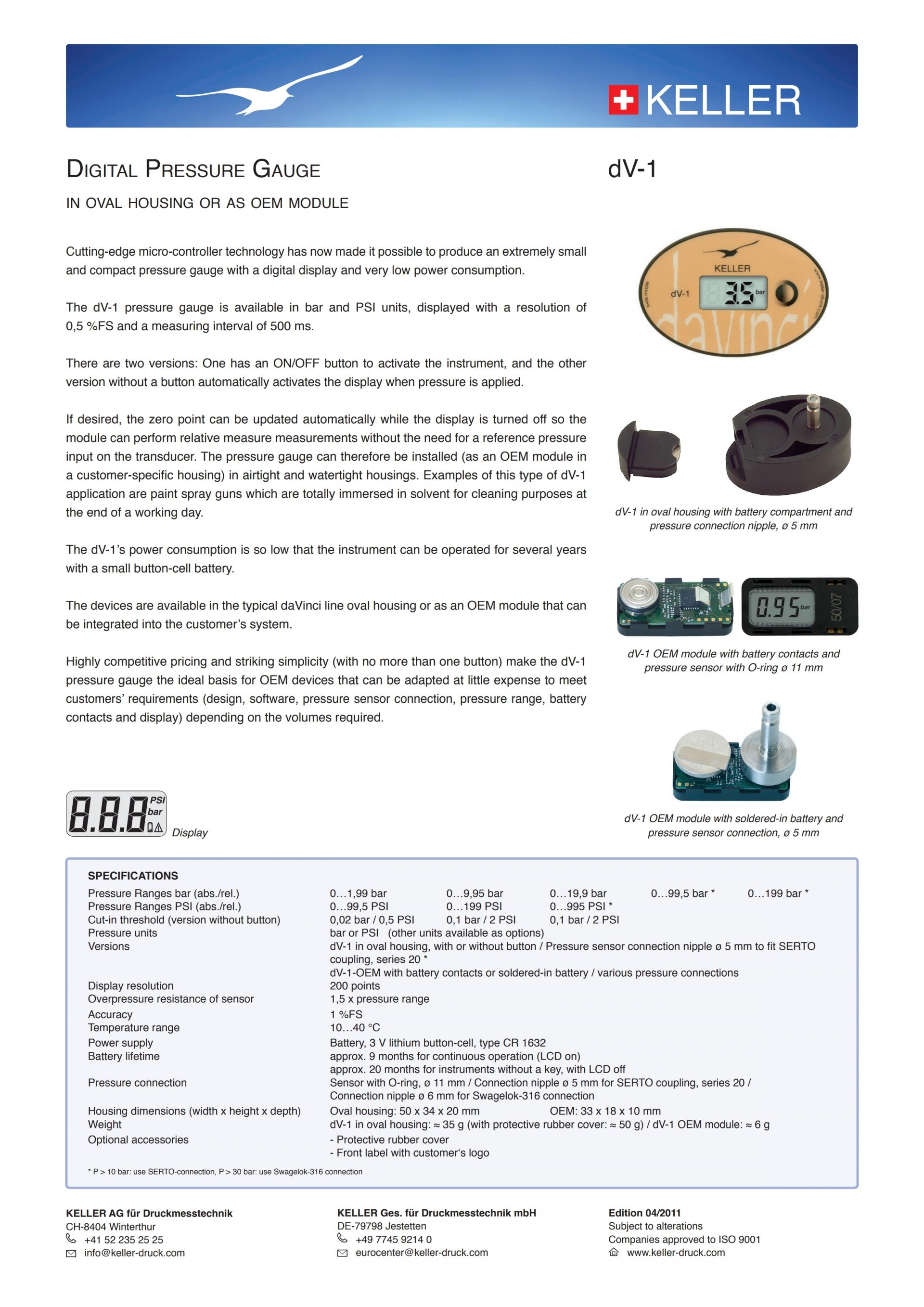 DV-1 압력 게이지는 고객의 요구 사항 (디자인, 소프트웨어, 압력 센서 연결, 압력 범위)을 충족시키기 위해 거의 비용을 들이지 않고도 적용 할 수있는 OEM 장치에 이상적인 토대가됩니다. , 배터리 접촉부 및 디스플레이).