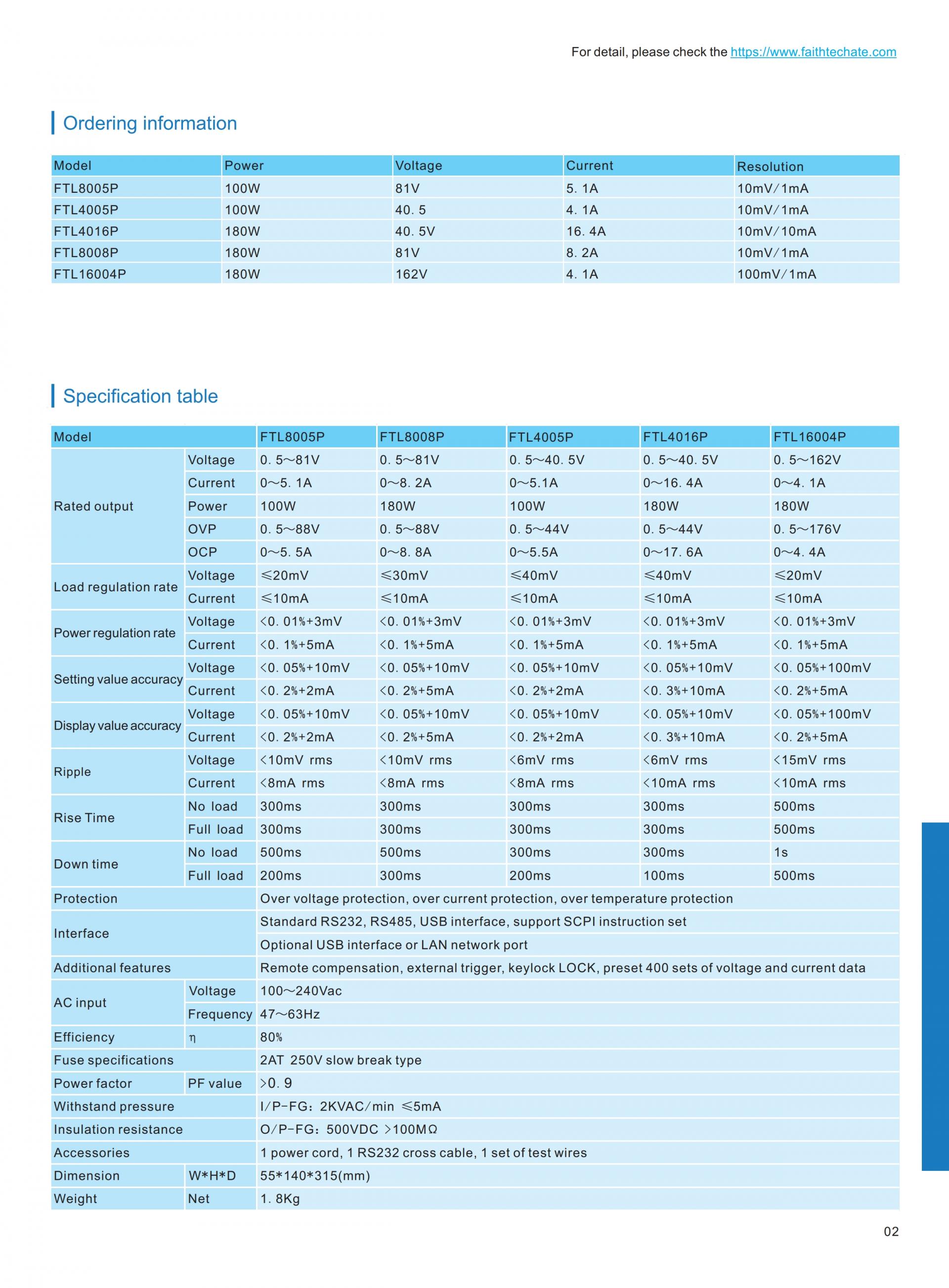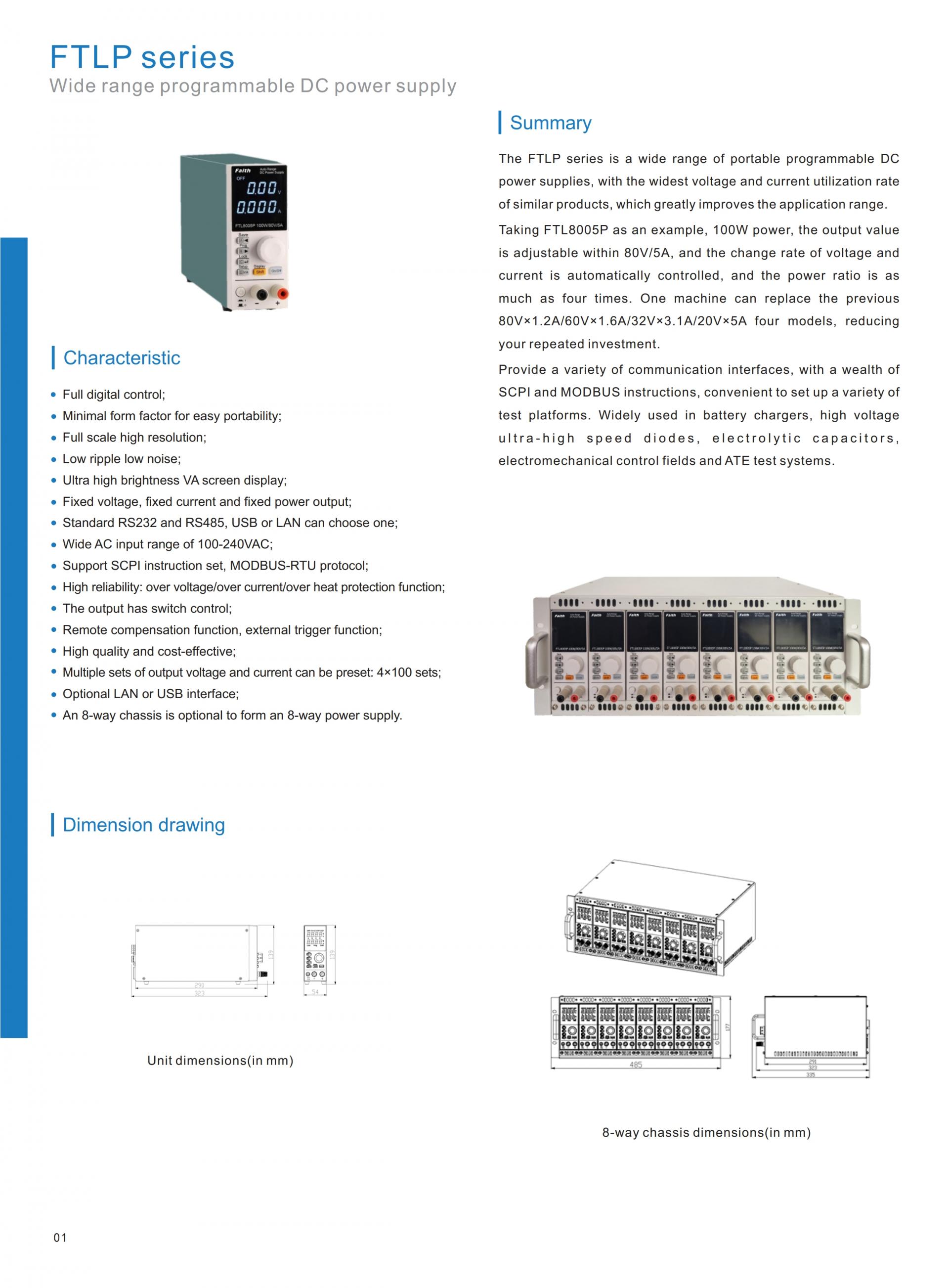 FTLP series is a kind of programmable Portable bench DC power supply, with the widest output range, which allows engineers to test more program requirements with just one device. To be exact, the FTLP series provides full power all the way down to 25% of the rated output voltage. The FTLP series is equipped with RS232 and RS485 as standard interfaces that are essential for system integration, you can also choose USB or LAN interface as your add-on interface. The series supports SCPI and MODBUS-RTU protocol, which is convenient for all kinds of test platform. The FTLP series DC power supply can be widely used in battery chargers, high-voltage ultra-high-speed diodes, electrolytic capacitors, electromechanical control fields, and ATE test systems, etc.
