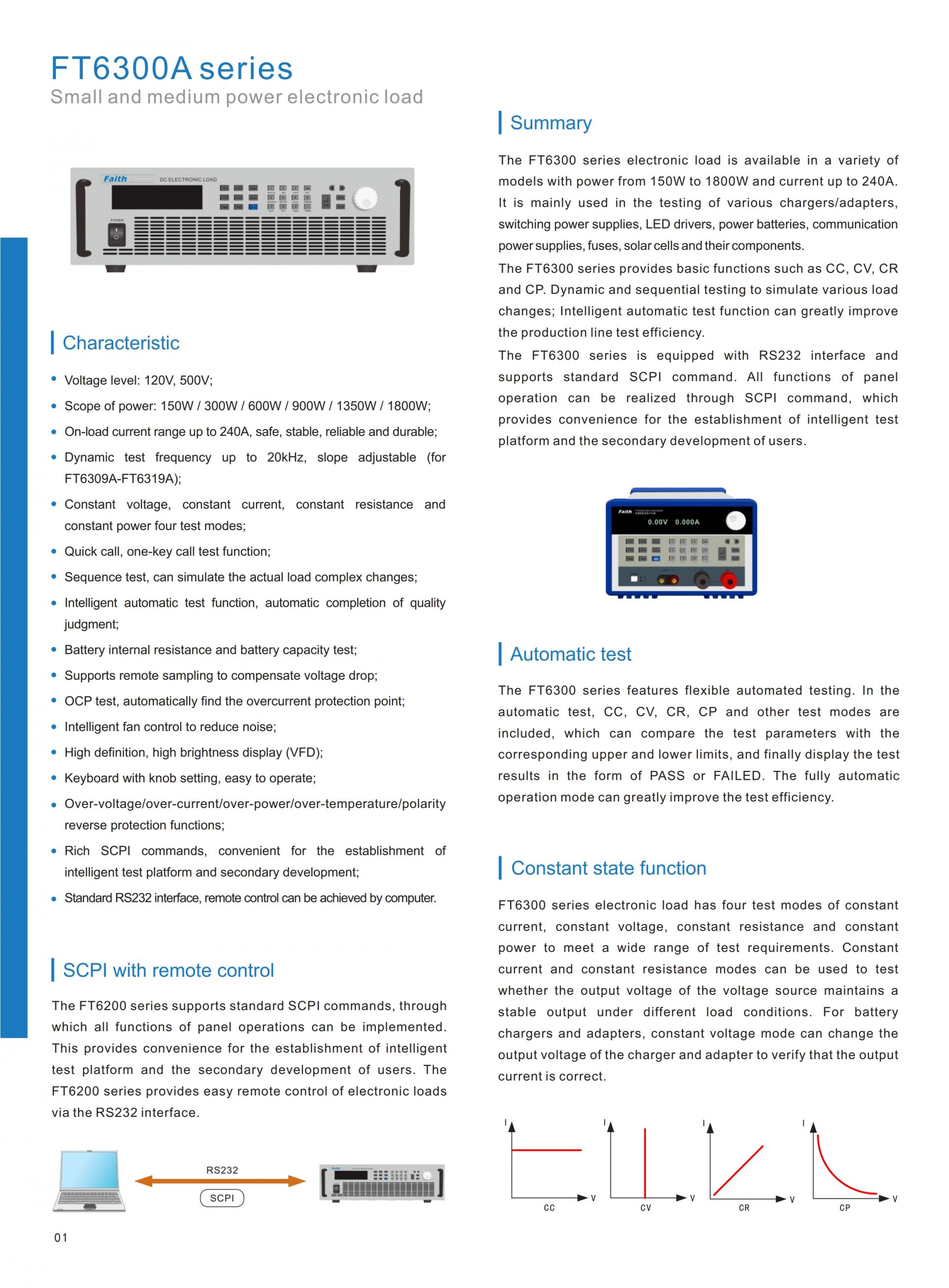 The FT6300 series electronic load is available in a variety of models with power from 150W to 1800W and current up to 240A. It is mainly used in the testing of various chargers/adapters, switching power supplies, LED drivers, power batteries, communication power supplies, fuses, solar cells and their components.