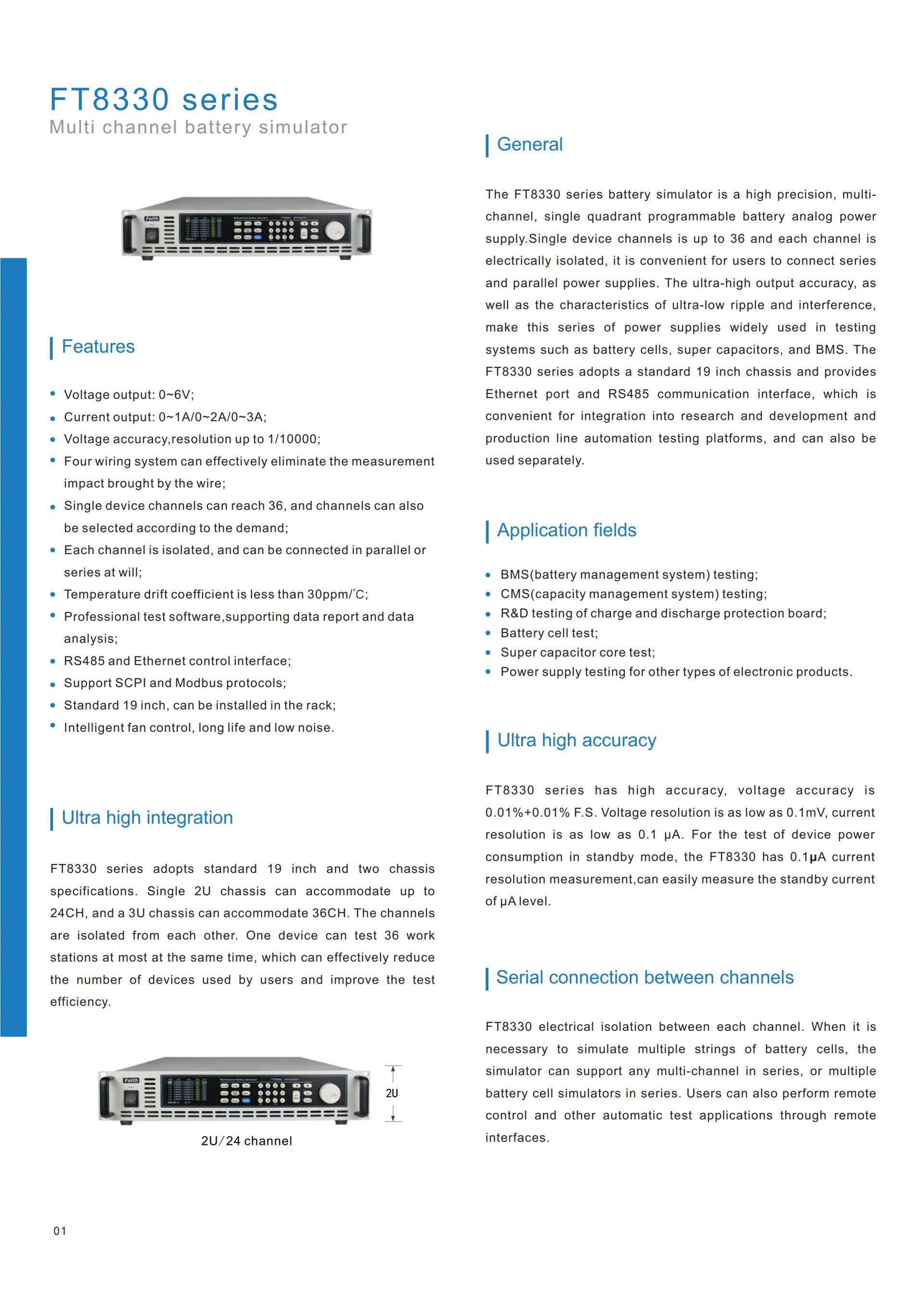 - The FT8330 series battery simulator is a high precision, multi-channel, single quadrant programmable battery analog power supply.Single device channels is up to 36 and each channel is electrically isolated, it is convenient for users to connect series and parallel power supplies. The ultra-high output accuracy, as well as the characteristics of ultra-low ripple and interference, make this series of power supplies widely used in testing systems such as battery cells, super capacitors, and BMS.