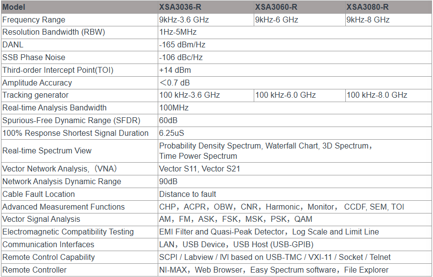 In spectrum analysis, the XSA3000-R delivers outstanding real-time performance with a 100% probability of intercept (POI) as short as 6.25 µs, and a spurious-free dynamic range up to 60dB. It offers a displayed average noise level (DANL) below
