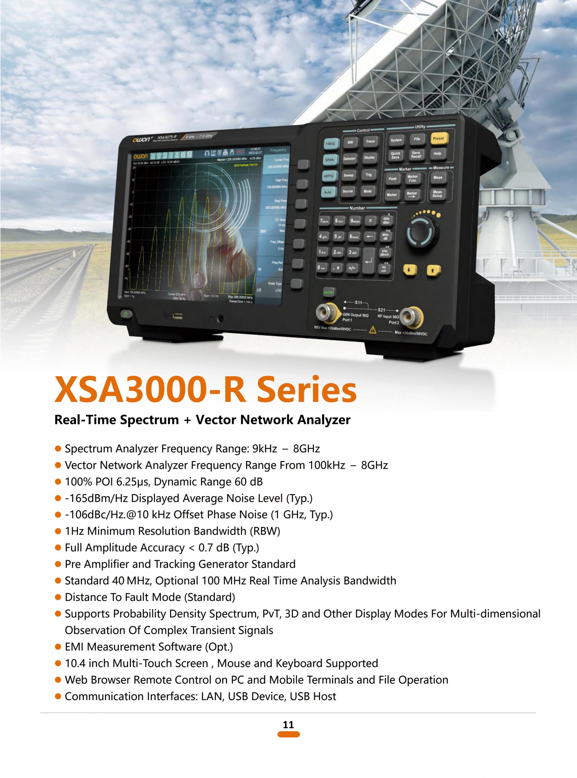 The XSA3000-R series integrates real-time spectrum analysis and vector network analysis, covering 9kHz – 8GHz (spectrum) and 100kHz – 8GHz (VNA), meeting needs from R&D to production testing.
