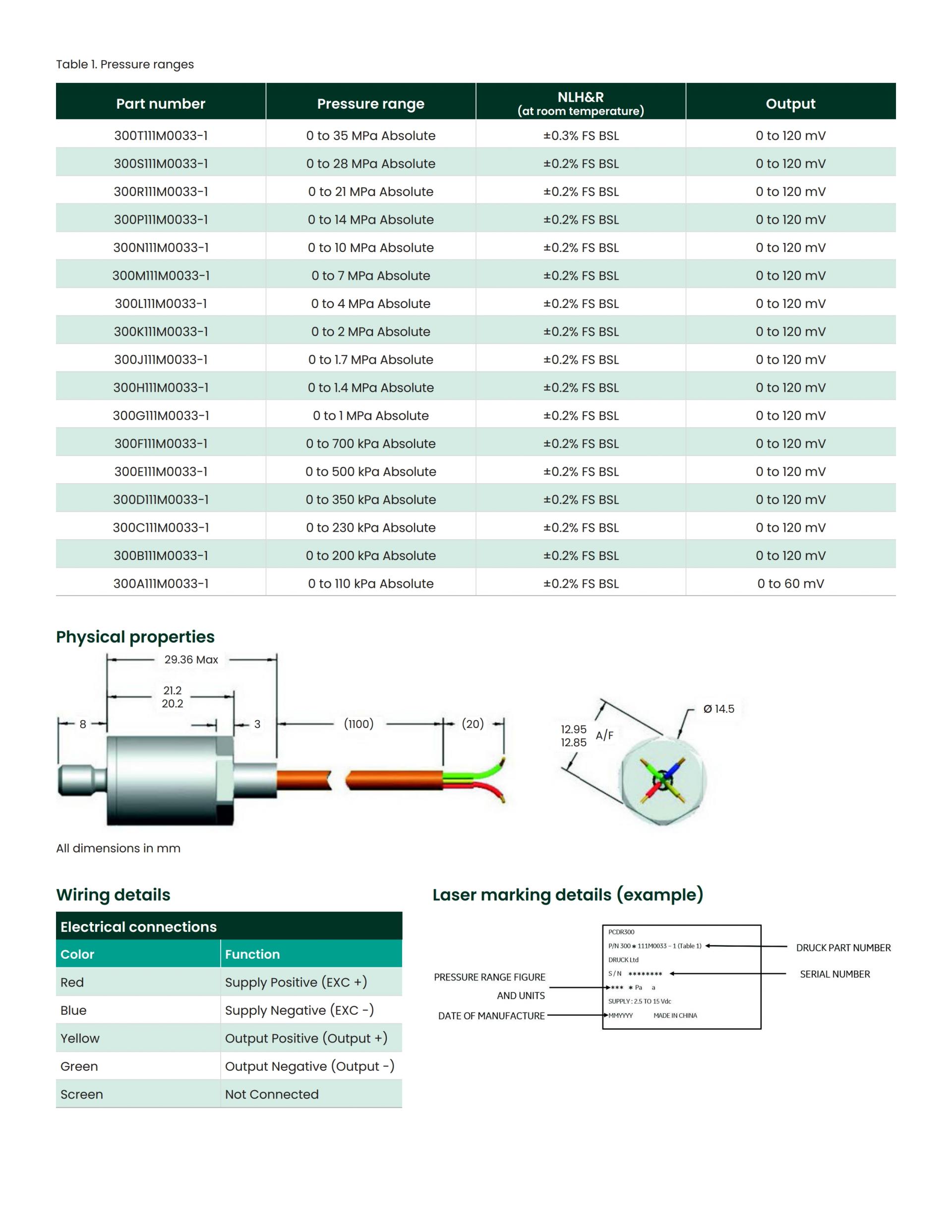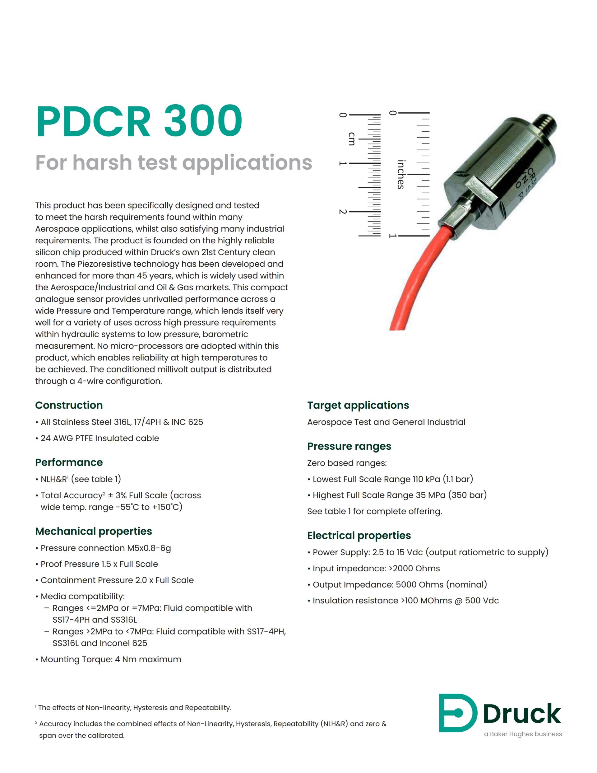 PDCR 300 is founded on the highly reliable silicon chip produced within Druck’s own 21st Century clean room. The Piezoresistive technology has been developed and enhanced for more than 45 years, which is widely used within the Aerospace / Industrial and Oil & Gas markets. This compact analogue sensor provides unrivalled performance across a wide Pressure and Temperature range, which lends itself very well for use in hydraulic applications. No micro-processors are adopted within this product, which enables reliability at high temperatures to be achieved. The conditioned millivolt output is distributed through a 4-wire configuration.