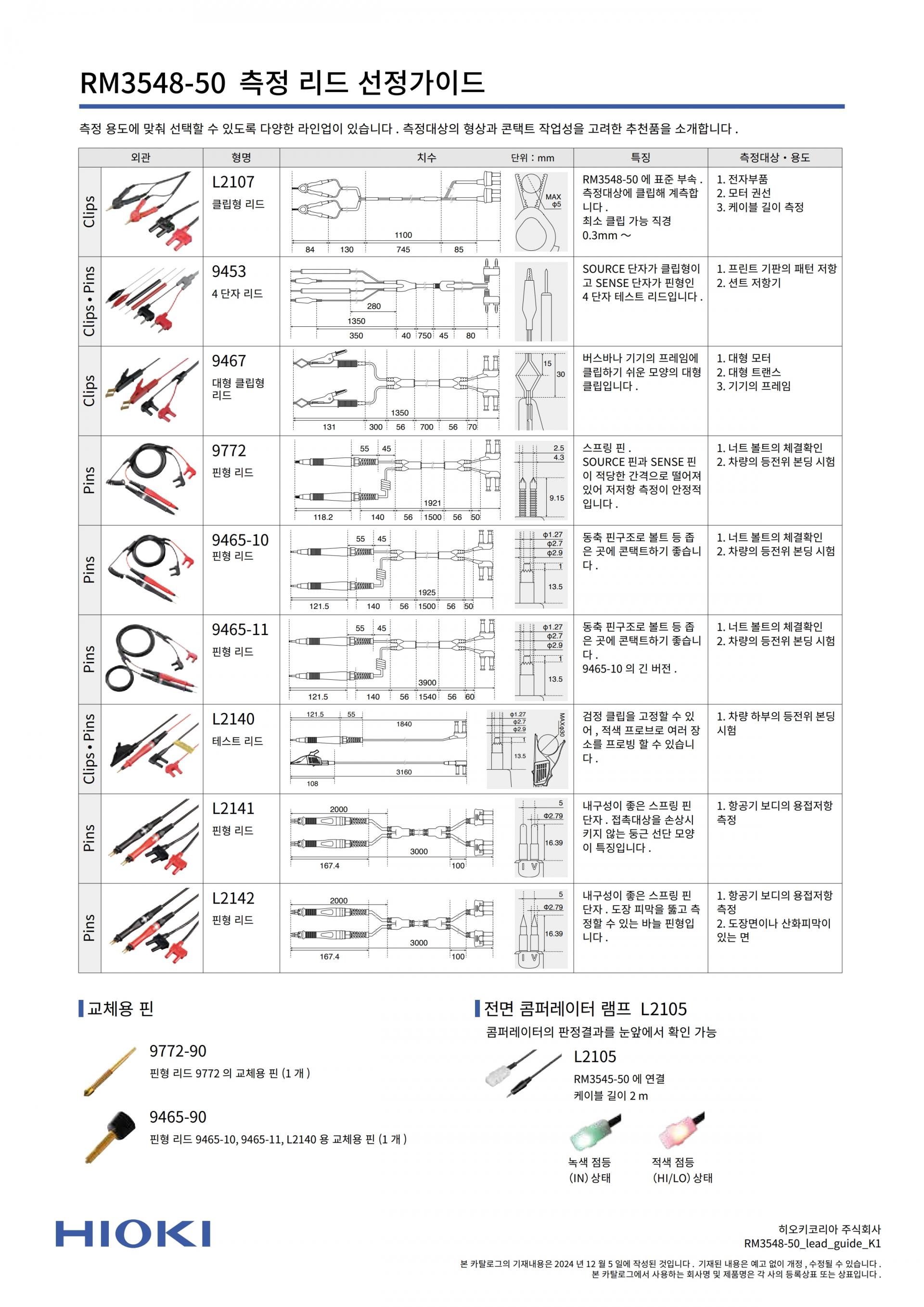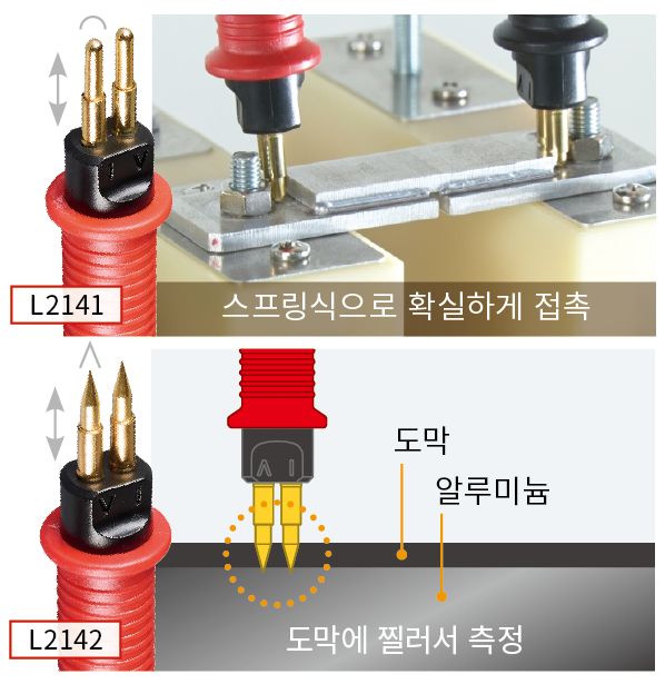 - L2141, L2142: 항공기 정비 및 오버홀 공정에 최적인 RM3548-50은 다양한 위치의 저항 차를 체크하는 등전위 본딩 시험에 적합합니다. 끝이 둥그스름한 핀형 프로브 L2141을 사용하면 항공기 본체를 손상시키지 않고 저항값을 측정할 수 있습니다.