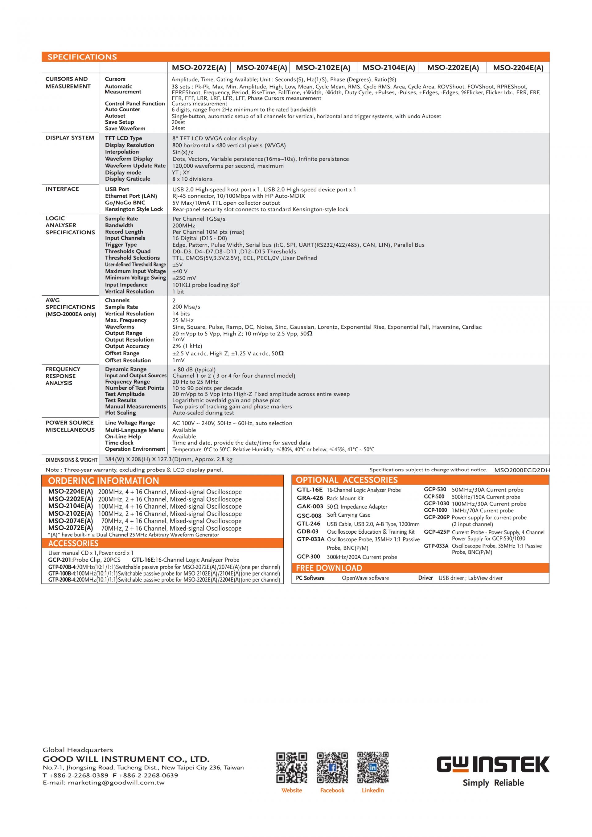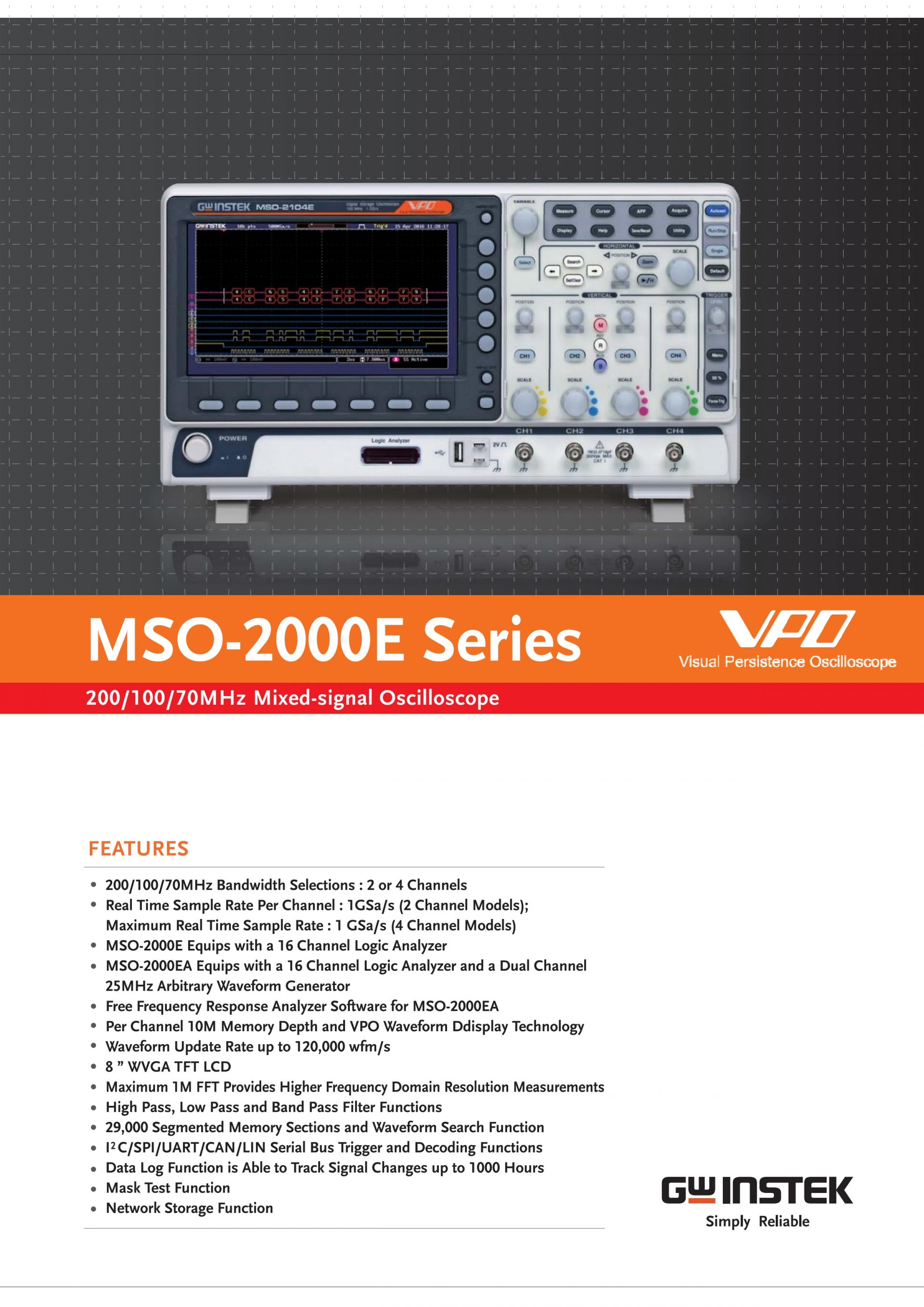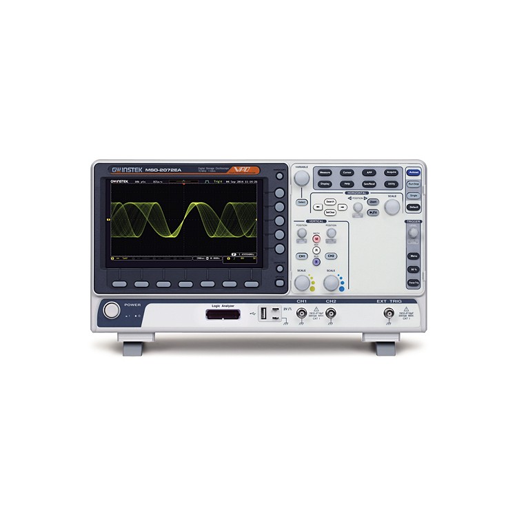 - MSO-2000EA equips with a 16-channel logic analyzer and a dual channel 25MHz arbitrary waveform generator